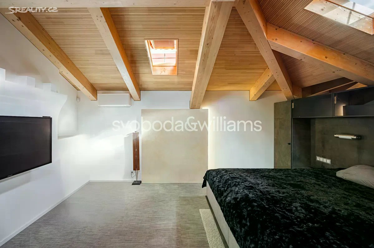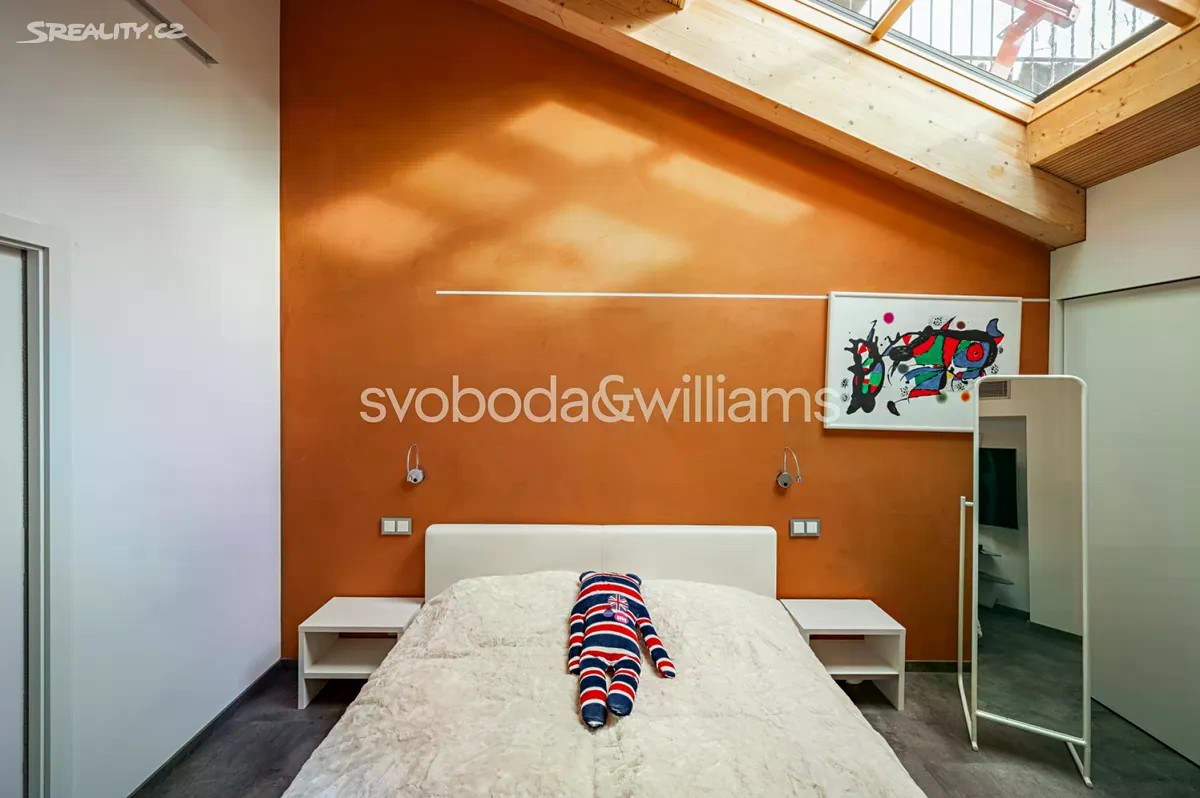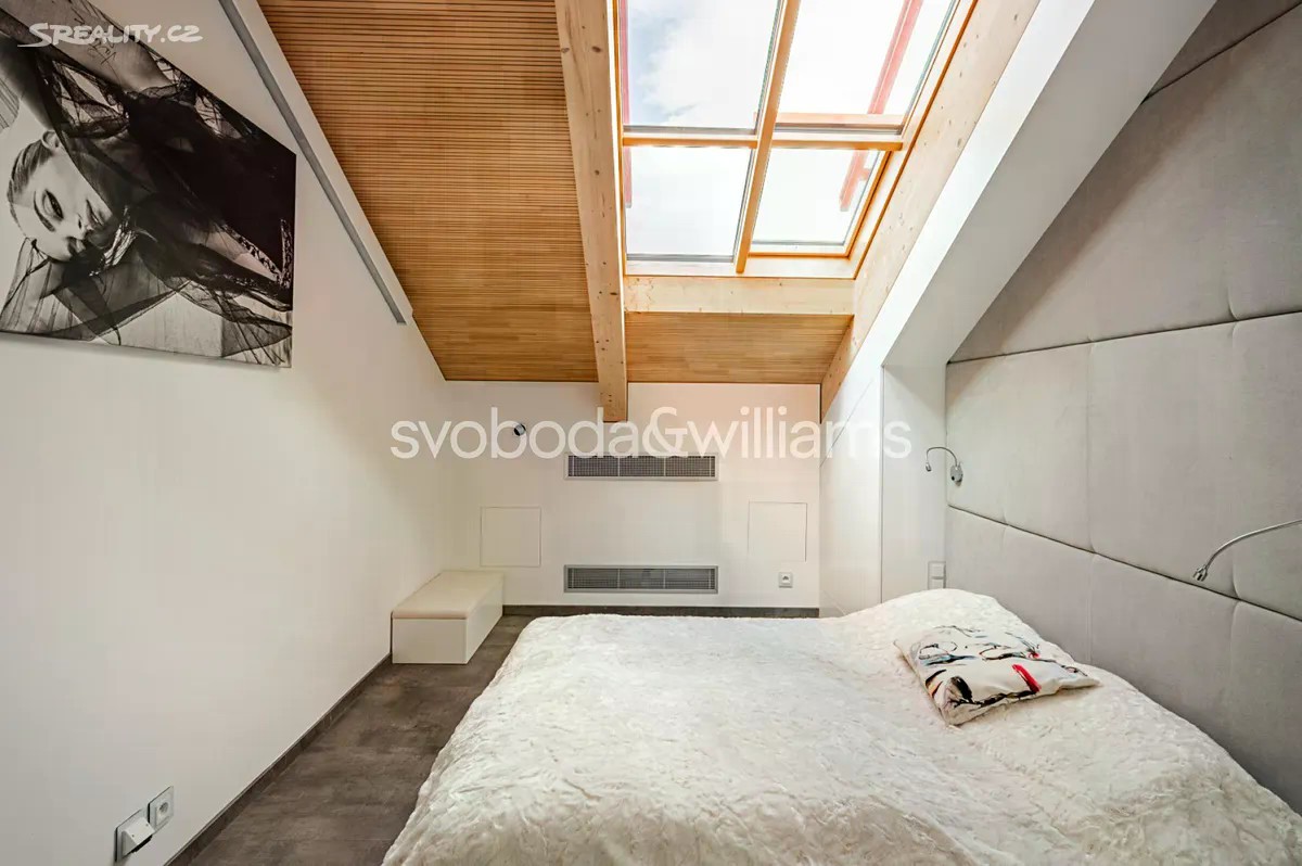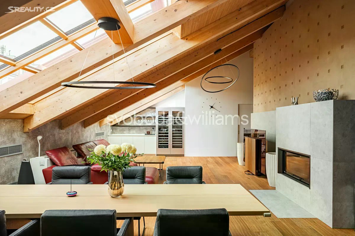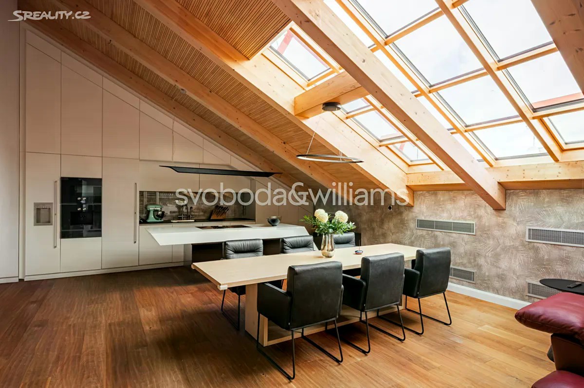 Na úctyhodné ploše 230 m² nejvyšších pater klasického bytového domu v Praze 2 se rozkládá klimatizovaný mezonetový byt, jehož interiér byl navržen v nadčasovém designu a ve vysokém standardu provedení. Atraktivní lokalita Nového Města jen několik minut chůze od Národního muzea a Václavského náměstí, v pěším dosahu stanice metra I.P.Pavlova i historického centra metropole. Hlavní obytná část bytu je situována ve vstupním, 6. nadzemním podlaží a tvoří ji obývací pokoj s krbem, jídelní částí a kompletně vybavenou kuchyní. Prostor doplňuje minimalistický bar a vinotéka. Soukromá zóna na jedné straně bytu zahrnuje hlavní ložnici s en-suite koupelnou (vana, sprchový kout, umyvadlo, toaleta) a vestavěnými šatními skříněmi, na opačné straně se nacházejí 2 ložnice a sdílená koupelna (sprchový kout, umyvadlo, toaleta). Ze vstupní chodby je dále přístupná technická místnost, samostatná toaleta a interiérové schodiště vedoucí do patra, které tvoří otevřená galerie v současnosti využívaná jako pracovna. Dominantním prvkem interiéru jsou velká ateliérová okna zasazená do šikmého dřevěného stropu nad obývacím prostorem, která poskytují panoramatický výhled na Prahu. Okna lze v případě potřeby zastínit. Nadstandardní vybavení bytu zahrnuje kuchyňskou linku Poggenpohl ve vysokém lesku se spotřebiči Gaggenau a varným ostrůvkem, krb na dřevo, vestavěný nábytek na míru a systém chytré domácnosti, který umožňuje dálkové ovládání podlahového topení, klimatizace, osvětlení, venkovního stínění, zabezpečení i domácích spotřebičů. Lokalita Nového města poskytuje vše potřebné v blízkém okolí - jsou zde školy všech stupňů, zdravotní služby včetně fakultní nemocnice, úřady, obchody, kulturní instituce a nespočet restaurací, pekáren, bister či kaváren. Na nedalekém Tylově náměstí se konají pravidelné farmářské trhy, bydlení ve městě zpříjemňuje také blízká Kateřinská zahrada a Čelakovského sady. Perfektní dopravní dostupnost zajišťuje dopravní uzel I.P.Pavlova se stanicí metra a zastávkami tramvají i autobusů včetně několika nočních linek. Možnost pronájmu 2 parkovacích míst přibližně 50 metrů od bytu. Podlahová plocha 229,7 m2.
