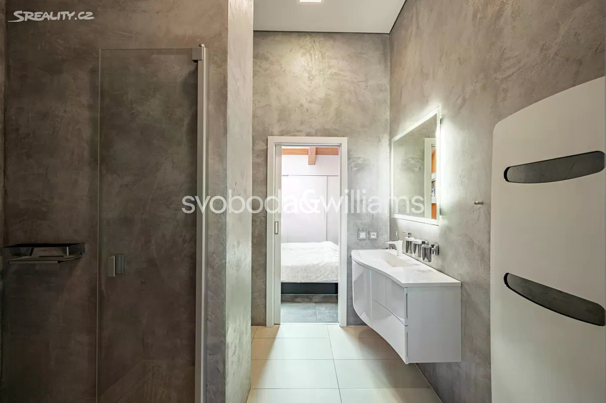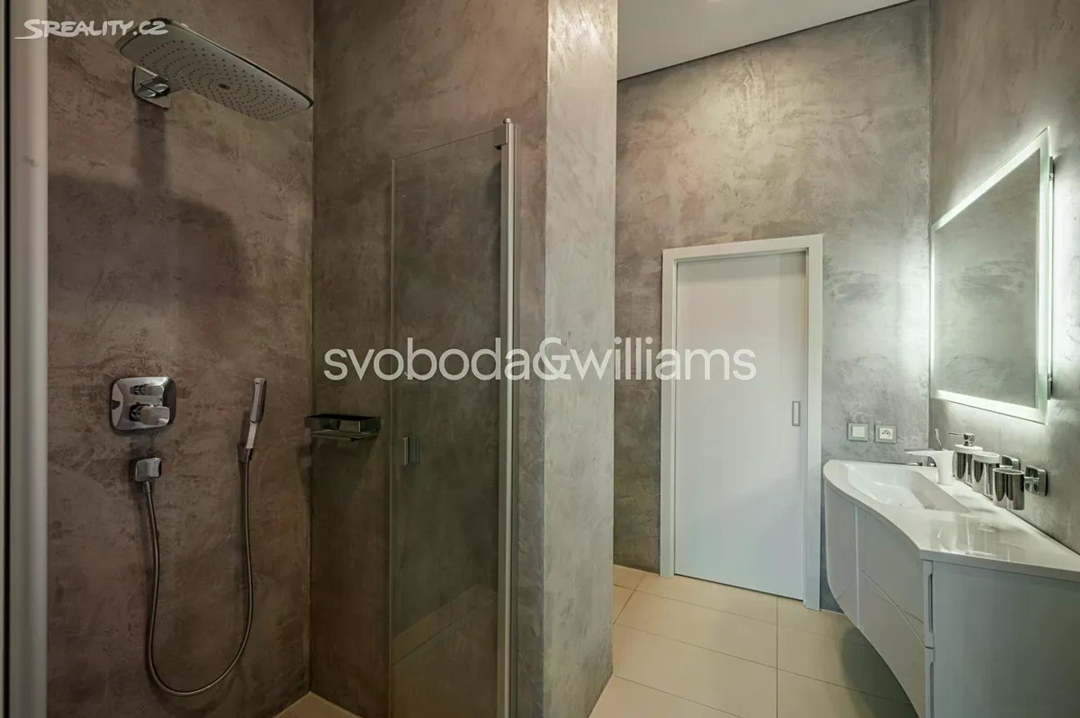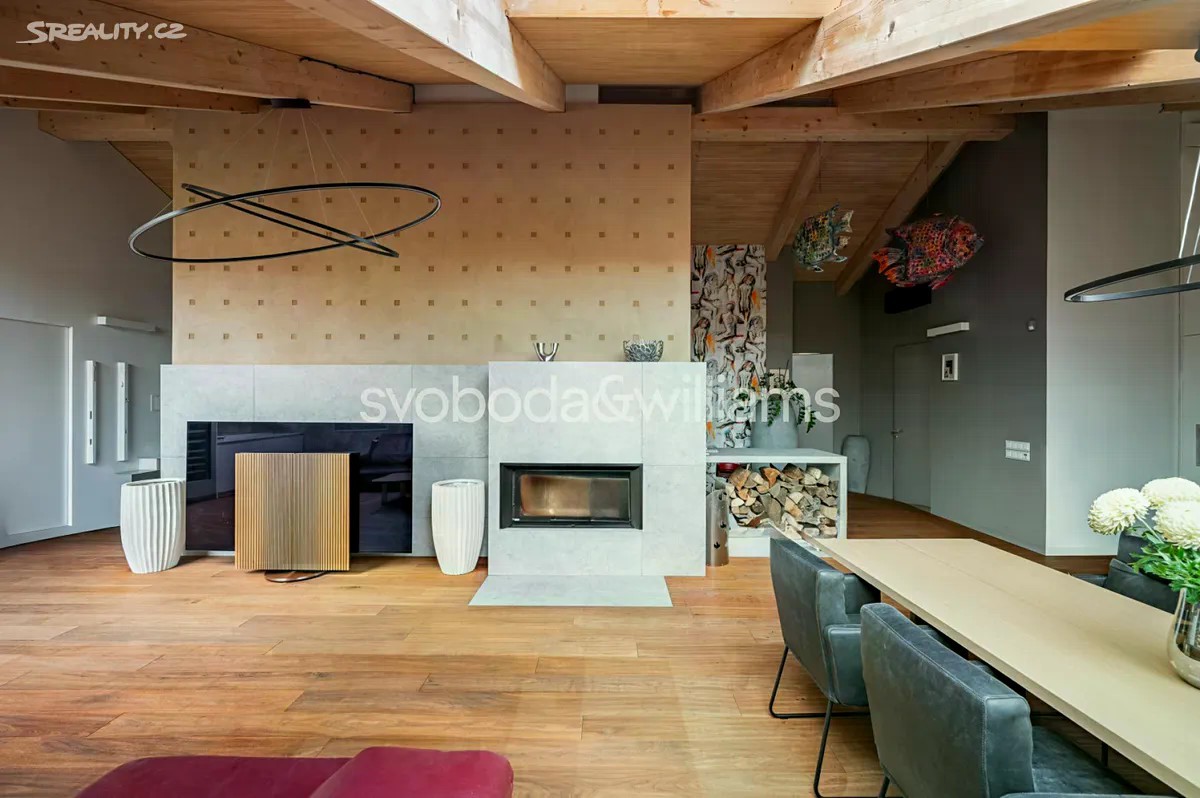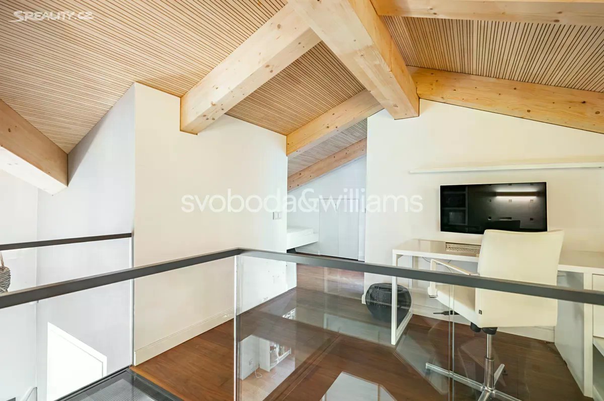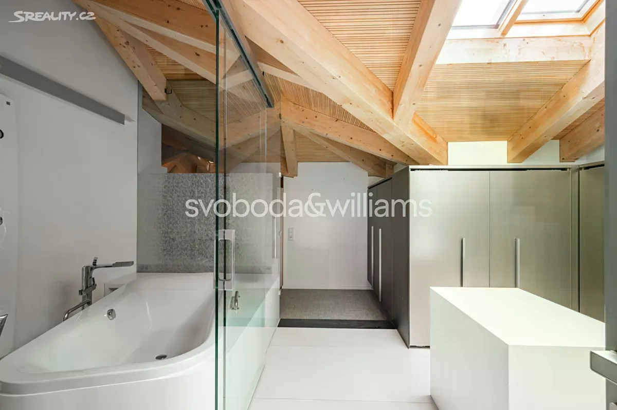 Na úctyhodné ploše 230 m² nejvyšších pater klasického bytového domu v Praze 2 se rozkládá klimatizovaný mezonetový byt, jehož interiér byl navržen v nadčasovém designu a ve vysokém standardu provedení. Atraktivní lokalita Nového Města jen několik minut chůze od Národního muzea a Václavského náměstí, v pěším dosahu stanice metra I.P.Pavlova i historického centra metropole. Hlavní obytná část bytu je situována ve vstupním, 6. nadzemním podlaží a tvoří ji obývací pokoj s krbem, jídelní částí a kompletně vybavenou kuchyní. Prostor doplňuje minimalistický bar a vinotéka. Soukromá zóna na jedné straně bytu zahrnuje hlavní ložnici s en-suite koupelnou (vana, sprchový kout, umyvadlo, toaleta) a vestavěnými šatními skříněmi, na opačné straně se nacházejí 2 ložnice a sdílená koupelna (sprchový kout, umyvadlo, toaleta). Ze vstupní chodby je dále přístupná technická místnost, samostatná toaleta a interiérové schodiště vedoucí do patra, které tvoří otevřená galerie v současnosti využívaná jako pracovna. Dominantním prvkem interiéru jsou velká ateliérová okna zasazená do šikmého dřevěného stropu nad obývacím prostorem, která poskytují panoramatický výhled na Prahu. Okna lze v případě potřeby zastínit. Nadstandardní vybavení bytu zahrnuje kuchyňskou linku Poggenpohl ve vysokém lesku se spotřebiči Gaggenau a varným ostrůvkem, krb na dřevo, vestavěný nábytek na míru a systém chytré domácnosti, který umožňuje dálkové ovládání podlahového topení, klimatizace, osvětlení, venkovního stínění, zabezpečení i domácích spotřebičů. Lokalita Nového města poskytuje vše potřebné v blízkém okolí - jsou zde školy všech stupňů, zdravotní služby včetně fakultní nemocnice, úřady, obchody, kulturní instituce a nespočet restaurací, pekáren, bister či kaváren. Na nedalekém Tylově náměstí se konají pravidelné farmářské trhy, bydlení ve městě zpříjemňuje také blízká Kateřinská zahrada a Čelakovského sady. Perfektní dopravní dostupnost zajišťuje dopravní uzel I.P.Pavlova se stanicí metra a zastávkami tramvají i autobusů včetně několika nočních linek. Možnost pronájmu 2 parkovacích míst přibližně 50 metrů od bytu. Podlahová plocha 229,7 m2.
