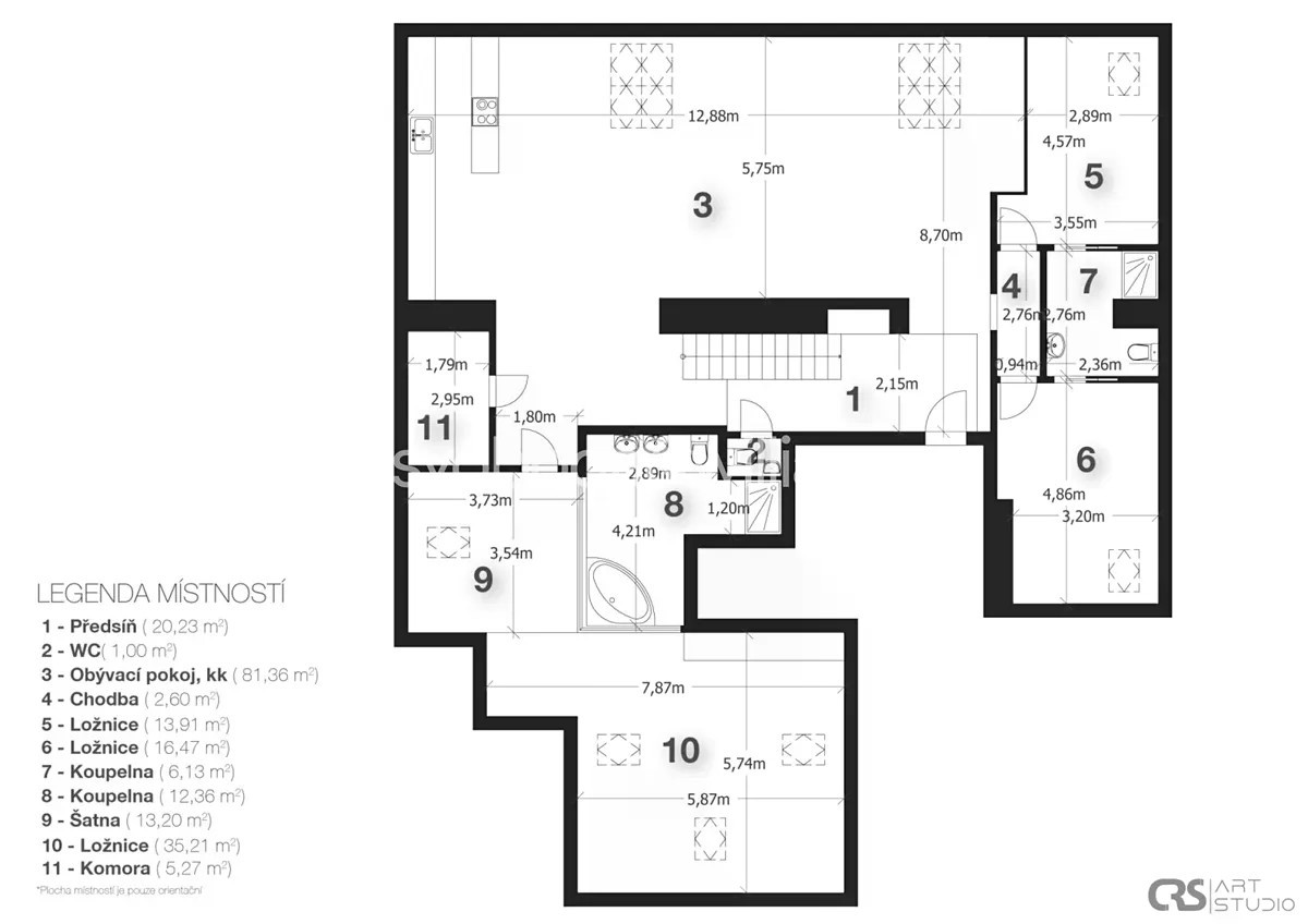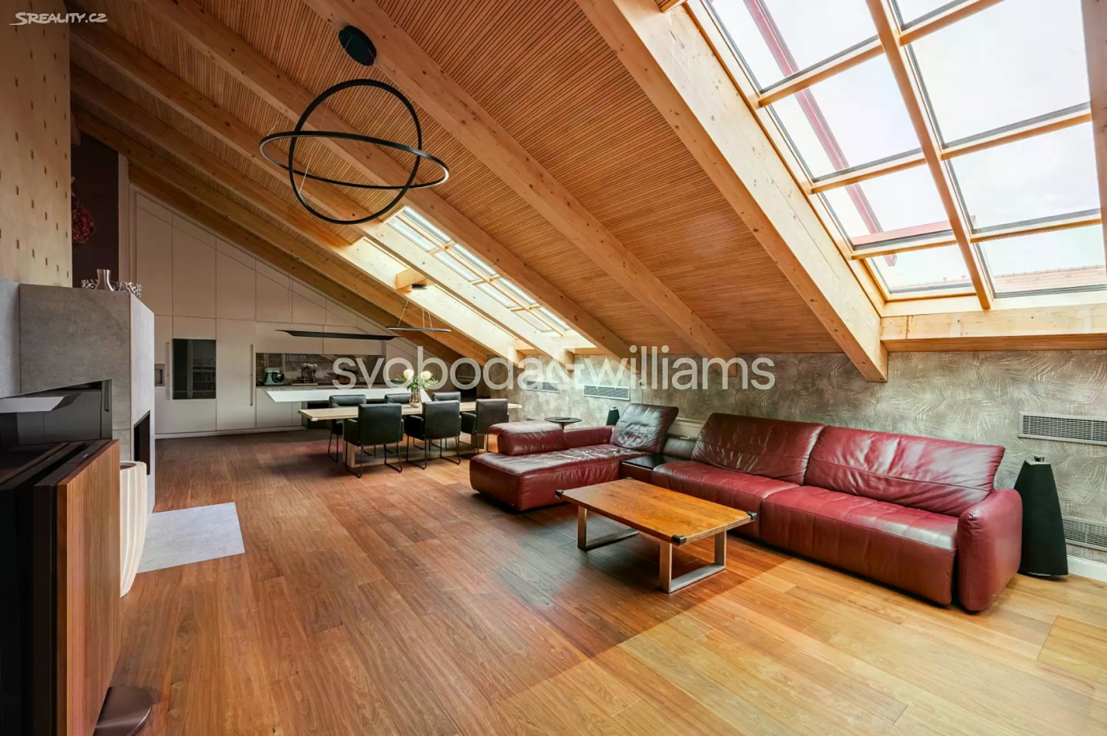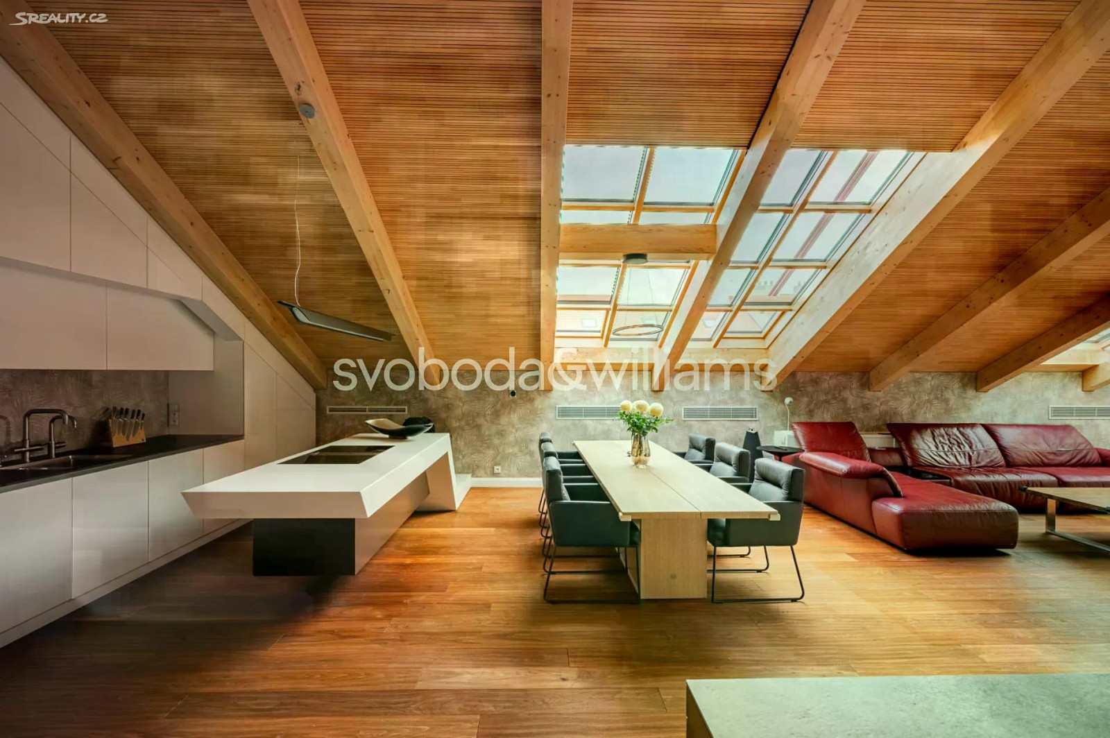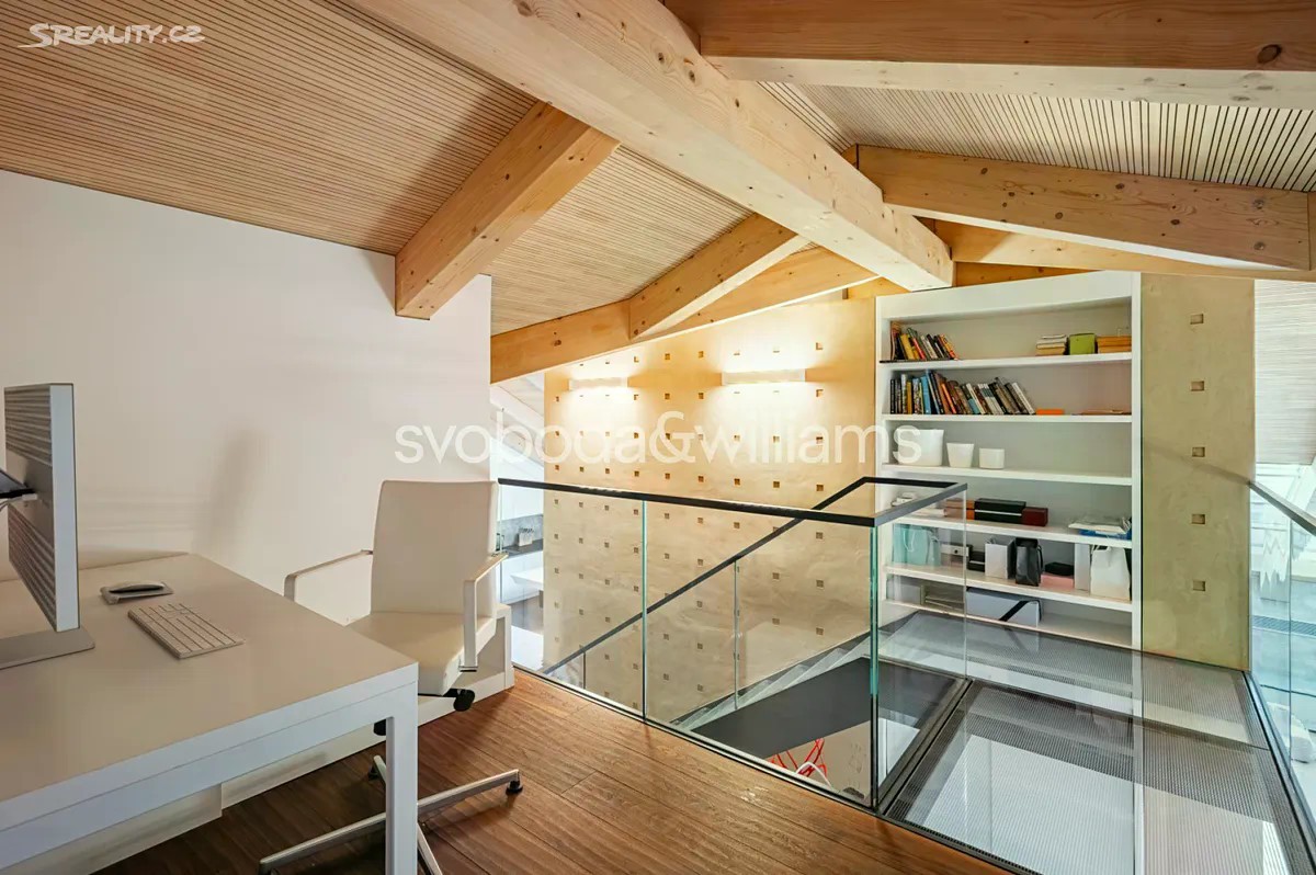 Na úctyhodné ploše 230 m² nejvyšších pater klasického bytového domu v Praze 2 se rozkládá klimatizovaný mezonetový byt, jehož interiér byl navržen v nadčasovém designu a ve vysokém standardu provedení. Atraktivní lokalita Nového Města jen několik minut chůze od Národního muzea a Václavského náměstí, v pěším dosahu stanice metra I.P.Pavlova i historického centra metropole. Hlavní obytná část bytu je situována ve vstupním, 6. nadzemním podlaží a tvoří ji obývací pokoj s krbem, jídelní částí a kompletně vybavenou kuchyní. Prostor doplňuje minimalistický bar a vinotéka. Soukromá zóna na jedné straně bytu zahrnuje hlavní ložnici s en-suite koupelnou (vana, sprchový kout, umyvadlo, toaleta) a vestavěnými šatními skříněmi, na opačné straně se nacházejí 2 ložnice a sdílená koupelna (sprchový kout, umyvadlo, toaleta). Ze vstupní chodby je dále přístupná technická místnost, samostatná toaleta a interiérové schodiště vedoucí do patra, které tvoří otevřená galerie v současnosti využívaná jako pracovna. Dominantním prvkem interiéru jsou velká ateliérová okna zasazená do šikmého dřevěného stropu nad obývacím prostorem, která poskytují panoramatický výhled na Prahu. Okna lze v případě potřeby zastínit. Nadstandardní vybavení bytu zahrnuje kuchyňskou linku Poggenpohl ve vysokém lesku se spotřebiči Gaggenau a varným ostrůvkem, krb na dřevo, vestavěný nábytek na míru a systém chytré domácnosti, který umožňuje dálkové ovládání podlahového topení, klimatizace, osvětlení, venkovního stínění, zabezpečení i domácích spotřebičů. Lokalita Nového města poskytuje vše potřebné v blízkém okolí - jsou zde školy všech stupňů, zdravotní služby včetně fakultní nemocnice, úřady, obchody, kulturní instituce a nespočet restaurací, pekáren, bister či kaváren. Na nedalekém Tylově náměstí se konají pravidelné farmářské trhy, bydlení ve městě zpříjemňuje také blízká Kateřinská zahrada a Čelakovského sady. Perfektní dopravní dostupnost zajišťuje dopravní uzel I.P.Pavlova se stanicí metra a zastávkami tramvají i autobusů včetně několika nočních linek. Možnost pronájmu 2 parkovacích míst přibližně 50 metrů od bytu. Podlahová plocha 229,7 m2.