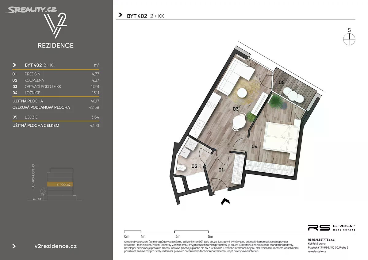 V2 rezidence - kde se hodnota bydlení násobí. Hledáte svůj první byt, nebo chytrou investici? V projektu V2 rezidence v pražských Košířích najdete nové byty od 1+kk po 3+kk v klidné čtvrti, ale jen kousek od centra. Projekt nabízí jedinečnou flexibilitu. Můžete si zvolit byt kompletně vybavený nábytkem i doplňky a rovnou se nastěhovat nebo jej začít pronajímat. Anebo vybrat základní standard a interiér si zařídíte podle vlastního vkusu. Nabízený byt o dispozici 2+kk a velikosti 42,2 m² je ve 4. patře a jeho součástí je lodžie o velikosti 3,6 m². K bytu je možné dokoupit sklepní kóji a parkovací stání (cena není zahrnuta do ceny inzerátu). Lokalita nabízí vše potřebné a zároveň výborné spojení s centrem. Na tramvaj Klamovka dojdete za tři minuty a za čtyři minuty jízdy jste na metru Anděl. V okolí nechybí obchody, služby ani parky pro odpočinek. Využít můžete výhodné financování v poměru 10/90. Pro koupi bytu vám tedy stačí počáteční investice ve výši pouhých 10 % z kupní ceny (zbytek až po podpisu kupní smlouvy). V rezidenci vznikne celkem 57 moderních bytů, z nichž každý disponuje balkonem, lodžií či terasou.