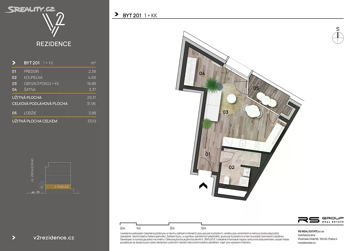 V2 rezidence - kde se hodnota bydlení násobí. Hledáte svůj první byt, nebo chytrou investici? V projektu V2 rezidence v pražských Košířích najdete nové byty od 1+kk po 3+kk v klidné čtvrti, ale jen kousek od centra. Projekt nabízí jedinečnou flexibilitu. Můžete si zvolit byt kompletně vybavený nábytkem i doplňky a rovnou se nastěhovat nebo jej začít pronajímat. Anebo vybrat základní standard a interiér si zařídíte podle vlastního vkusu. Nabízený byt o dispozici 1+kk a velikosti 32.2 m² je ve 2. patře a jeho součástí je lodžie o velikosti 3,9 m². K bytu je možné dokoupit sklepní kóji a parkovací stání (cena není zahrnuta do ceny inzerátu). Lokalita nabízí vše potřebné a zároveň výborné spojení s centrem. Na tramvaj Klamovka dojdete za tři minuty a za čtyři minuty jízdy jste na metru Anděl. V okolí nechybí obchody, služby ani parky pro odpočinek. Využít můžete výhodné financování v poměru 10/90. Pro koupi bytu vám tedy stačí počáteční investice ve výši pouhých 10 % z kupní ceny (zbytek až po podpisu kupní smlouvy). V rezidenci vznikne celkem 57 moderních bytů, z nichž každý disponuje balkonem, lodžií či terasou.