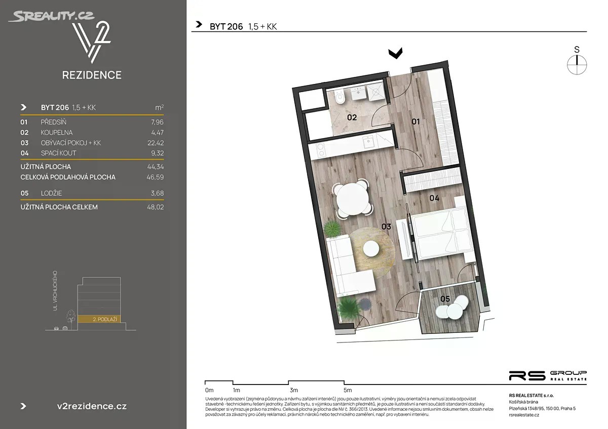 V2 rezidence - kde se hodnota bydlení násobí. Hledáte svůj první byt, nebo chytrou investici? V projektu V2 rezidence v pražských Košířích najdete nové byty od 1+kk po 3+kk v klidné čtvrti, ale jen kousek od centra. Projekt nabízí jedinečnou flexibilitu. Můžete si zvolit byt kompletně vybavený nábytkem i doplňky a rovnou se nastěhovat nebo jej začít pronajímat. Anebo vybrat základní standard a interiér si zařídíte podle vlastního vkusu. Nabízený byt o dispozici 1,5+kk a velikosti 46.6 m² je ve 2. patře a jeho součástí je lodžie o velikosti 3,7 m². K bytu je možné dokoupit sklepní kóji a parkovací stání (cena není zahrnuta do ceny inzerátu). Lokalita nabízí vše potřebné a zároveň výborné spojení s centrem. Na tramvaj Klamovka dojdete za tři minuty a za čtyři minuty jízdy jste na metru Anděl. V okolí nechybí obchody, služby ani parky pro odpočinek. Využít můžete výhodné financování v poměru 10/90. Pro koupi bytu vám tedy stačí počáteční investice ve výši pouhých 10 % z kupní ceny (zbytek až po podpisu kupní smlouvy). V rezidenci vznikne celkem 57 moderních bytů, z nichž každý disponuje balkonem, lodžií či terasou.