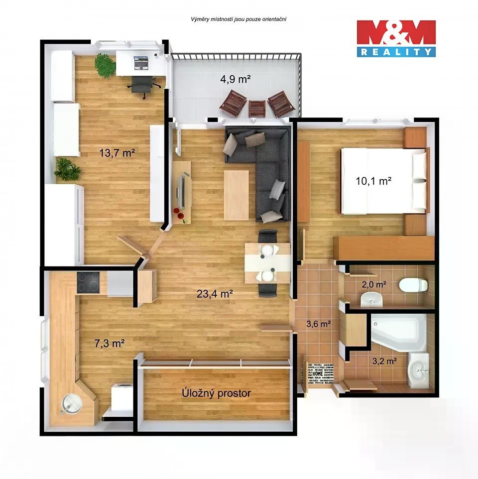 Nabízíme k pronájmu prostorný byt 3+kk o užitné ploše 68 m², nacházející se v klidné části Liberce VI-Rochlice, ul. Nádvorní. Tento byt je umístěn v cihlovém domě z roku 2009 a nabízí ideální kombinaci klidu a dostupnosti městské infrastruktury. Byt je ve velmi dobrém stavu a je připraven k nastěhování od 1.12.2025. Dispozice bytu zahrnuje prostorný obývací pokoj uprostřed bytu, dále kuchyň, dvě ložnice, koupelnu a samostatné WC. Lokalita nabízí veškerou občanskou vybavenost, včetně obchodů, škol a veřejné dopravy. K bytu náleží sklepní kóje. Nájem je 18 000,- Kč, stejně tak provize RK. Vratná kauce činí 30 000,- Kč. Zálohy na energie záleží na počtu osob užívající byt, aktuálně je záloha nastavena na 3 044,- Kč. Elektřinu si řeší nájemník sám. Po nájemnících bude majitel vyžadovat pojištění domácnosti a potvrzení bezdlužnosti. Pokud hledáte komfortní bydlení v klidné části města, tento byt je pro Vás ideální volbou. Neváhejte a domluvte si prohlídku ještě dnes.