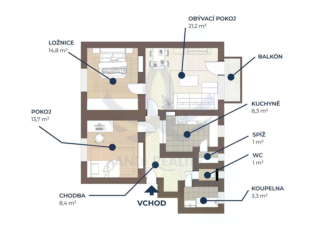 Prostor, klid a skutečný pocit domova v okamžiku, kdy otevřete dveře. Hledáte bydlení, které nepůsobí jen jako „další byt“, ale jako místo, kde se okamžitě cítíte dobře? Tenhle byt 3+1 v ulici Erbenova v Mladé Boleslavi přesně to nabízí. Světlo, prakticky řešený prostor, kvalitní úpravy a hlavně atmosféru, která působí jako domov od prvního okamžiku. Nachází se ve čtvrtém patře cihlového domu bez výtahu, má prostorný balkon, příjemně světlý obývací pokoj s kamenným obkladem na stěně a praktickou spíž přímo v kuchyni. Všechny úložné prostory jsou vyřešeny tak, aby celý byt působil čistě, vzdušně a funkčně. Stropy jsou zateplené, což výrazně zlepšuje energetické vlastnosti bytu a zároveň zvyšuje teplotní komfort v průběhu celého roku. Obývací pokoj s karamelovou rohovou sedačkou doplňuje stylová světla a atmosféra, která zve k odpočinku i večerům s rodinou. Koupelna nabízí vanu, umyvadlo a okno pro přirozené větrání. Ložnice mají velké vestavěné skříně, které šetří prostor a zvyšují komfort. Lokalita Tichá a žádaná část Mladé Boleslavi, doslova pár minut od všech služeb, které ke komfortnímu bydlení potřebujete. V pěší vzdálenosti jsou školy, školky, obchody, lékárny, lékaři i sportoviště. Skvělé spojení do centra i MHD. Ideální místo pro pohodlné bydlení v klidu, ale blízko všeho, co potřebujete. Pro všechny nadšence zdravého životního stylu a s láskou k pohybu. Možnost připojení k internetu. Nájemné: 21.000 Kč/měsíc Zálohy na služby (elektřina, teplo a voda): 6.500 Kč/měsíc/ 4 osoby Elektřina: převod na nájemníka (cca 3.000 Kč/měsíc)/ 4 osoby Vratná kauce 21.000,- Kč + provize RK 21.000 Kč + DPH Byt je volný a k dispozici hned. Ideální pro rodinu či kamarády hledající pohodlné a okamžitě obyvatelné bydlení. Ráda Vás bytem provedu osobně, ať si můžete prostor i atmosféru naplno zažít. Těším se na setkání. Dekorace není součástí vybavení bytu.
