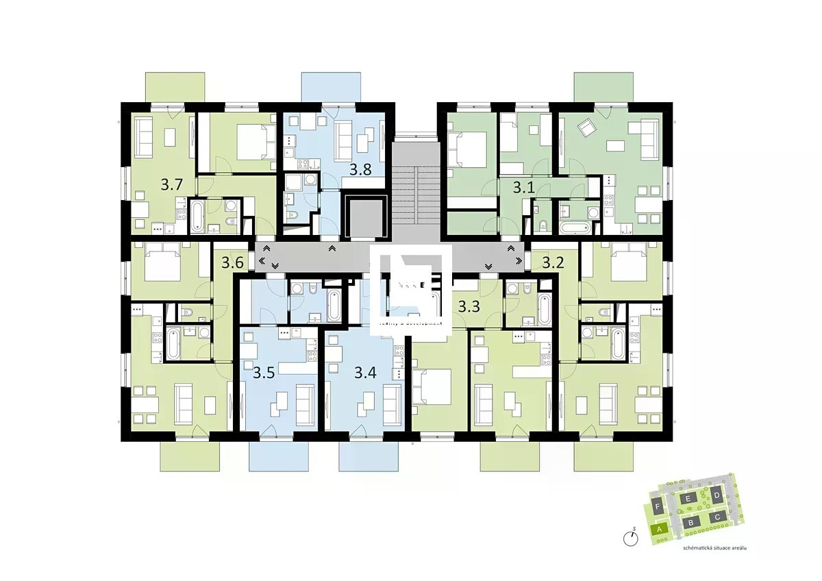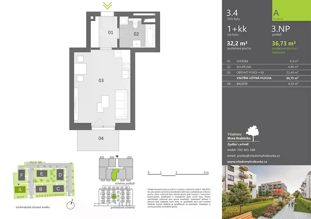 Kompletní nabídka developerského projektu ke shlédnutí na stránkách viladomyhrabuvka. Aktuálně z pověření developera realitní kancelář ALLE reality&development s.r.o. v exkluzivním zastoupení spouští prodej třetí etapy úspěšného projektu bytových domů Viladomy Nová Hrabůvka v Ostravě. Třetí etapa projektu se skládá ze dvou domů s označením „A“ a „B“. Každý z domů nabídne 30 bytových jednotek dispozice 1+kk až 3+kk. Všechny byty mají balkón nebo terasu, byty v přízemí potom vlastní oplocené předzahrádky. Ke každému bytu jsou k dispozici komory a parkovací místa ve společných garážích, nebo vnější parkovací místa chráněná vjezdovou závorou. Výstavba již byla zahájena a předpokládaný termín kolaudace je plánován na konec roku 2026. Byt s označením A3.4 o dispozici 1+kk se nachází ve 3.NP pětipodlažní budovy „A“. Bytová jednotka má rozlohu 32,2 m2 k níž přísluší balkon o velikosti 4,53 m2. V ceně standardního vybavení jsou kvalitní podlahy značky Egger, kompletní vybavení koupelny od koupelnového studia Ptáček s.r.o. a interiérové dveře Classen. Barevné provedení standardu na přání klienta. Dokonalé zateplení domu, kvalitní okna s trojitým zasklením a solární elektrárna jsou zárukou nízkých provozních nákladů. Díky tomu jsou domy dle energetického štítku zařazeny do kategorie „B - Vysoce úsporné budovy“. Projekt se nachází v příjemné a oblíbené rezidenční lokalitě města Ostravy. Předností je výborná občanská vybavenost a dostupnost MHD, která Vás za pár chvil dopraví do centra města. Projekt nabízí výhodné financování. Při rezervaci bytu hradí klient 30.000,- Kč rezervační poplatek, po podpisu smlouvy budoucí kupní pouze 15% z kupní ceny a po kolaudaci doplatek 85%. Klient hradí nad rámec kupní ceny poplatek za právní a administrativní servis.