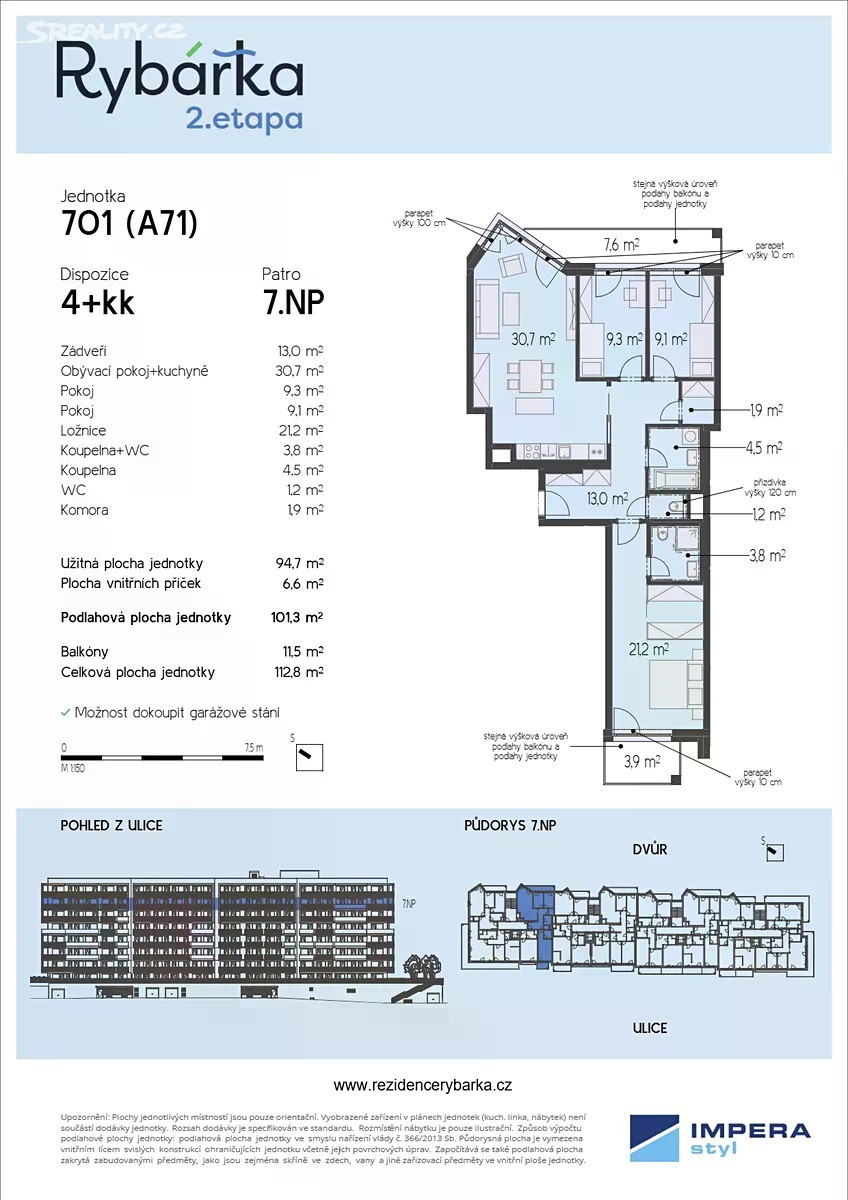 V rámci druhé etapy moderního rezidenčního projektu Rezidence Rybářka nabízíme k prodeji byt o dispozici 4+kk s podlahovou plochou 101,3 m², situovaný v 7. nadzemním podlaží osmipodlažní novostavby. Tento byt je ideální volbou pro ty, kteří hledají komfortní bydlení v centru města. Dispozice bytu zahrnuje vstupní chodbu (13 m²), obývací pokoj s kuchyňským koutem (30,7 m²), ložnici (21,2 m²), pokoj (9,3 m²), pokoj (9,1 m²), komoru (1,9 m²), koupelnu s WC (3,8 m²) samostatnou koupelnu ( 4,5 m²) a WC (1,2 m²). K bytu dále náleží 2 balkony o velikosti 3,9 m² a 7,6 m², které nabízí příjemné soukromí a prostor pro relaxaci. K jednotce je možné dokoupit sklep za cenu 60.000 Kč/m² a kryté parkovací stání za 790.000 Kč. Rezidence Rybářka se nachází v atraktivní lokalitě nedaleko centra Brna, v těsné blízkosti nově vybudované náplavky u řeky Svratky. Procházky podél vody, ranní běh nebo večerní drink na břehu - to vše máte doslova pár kroků od domova. Lokalita zároveň nabízí výbornou dostupnost do centra města, kompletní občanskou vybavenost a blízkost přírody. Projekt klade důraz na moderní technologie, úsporné řešení vytápění a vysoký standard provedení. Komfortní bydlení doplňuje možnost parkování v podzemní garáži a příjemné prostředí zeleného vnitrobloku. Máte zájem o více informací? Neváhejte nás kontaktovat - rádi vám představíme nejen tento byt, ale i další dostupné jednotky v projektu.