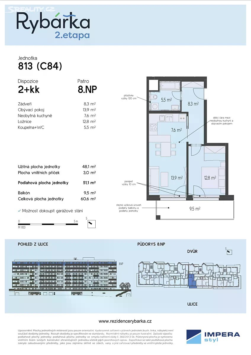 V rámci druhé etapy moderního rezidenčního projektu Rezidence Rybářka nabízíme k prodeji byt o dispozici 2+kk s podlahovou plochou 51,1 m², situovaný v 8. nadzemním podlaží osmipodlažní novostavby. Tento byt je ideální volbou pro ty, kteří hledají komfortní bydlení v centru města. Dispozice bytu zahrnuje vstupní chodbu (8,3 m²), obývací pokoj s kuchyňským koutem (21,5 m²), ložnici (12,8 m²) a koupelnu s WC (5,5 m²). K bytu dále náleží balkon o velikosti 9,5 m², který nabízí příjemné soukromí a prostor pro relaxaci. K jednotce je možné dokoupit sklep za cenu 60.000 Kč/m² a kryté parkovací stání za 790.000 Kč. Rezidence Rybářka se nachází v atraktivní lokalitě nedaleko centra Brna, v těsné blízkosti nově vybudované náplavky u řeky Svratky. Procházky podél vody, ranní běh nebo večerní drink na břehu - to vše máte doslova pár kroků od domova. Lokalita zároveň nabízí výbornou dostupnost do centra města, kompletní občanskou vybavenost a blízkost přírody. Projekt klade důraz na moderní technologie, úsporné řešení vytápění a vysoký standard provedení. Komfortní bydlení doplňuje možnost parkování v podzemní garáži a příjemné prostředí zeleného vnitrobloku. Máte zájem o více informací? Neváhejte nás kontaktovat - rádi vám představíme nejen tento byt, ale i další dostupné jednotky v projektu.
