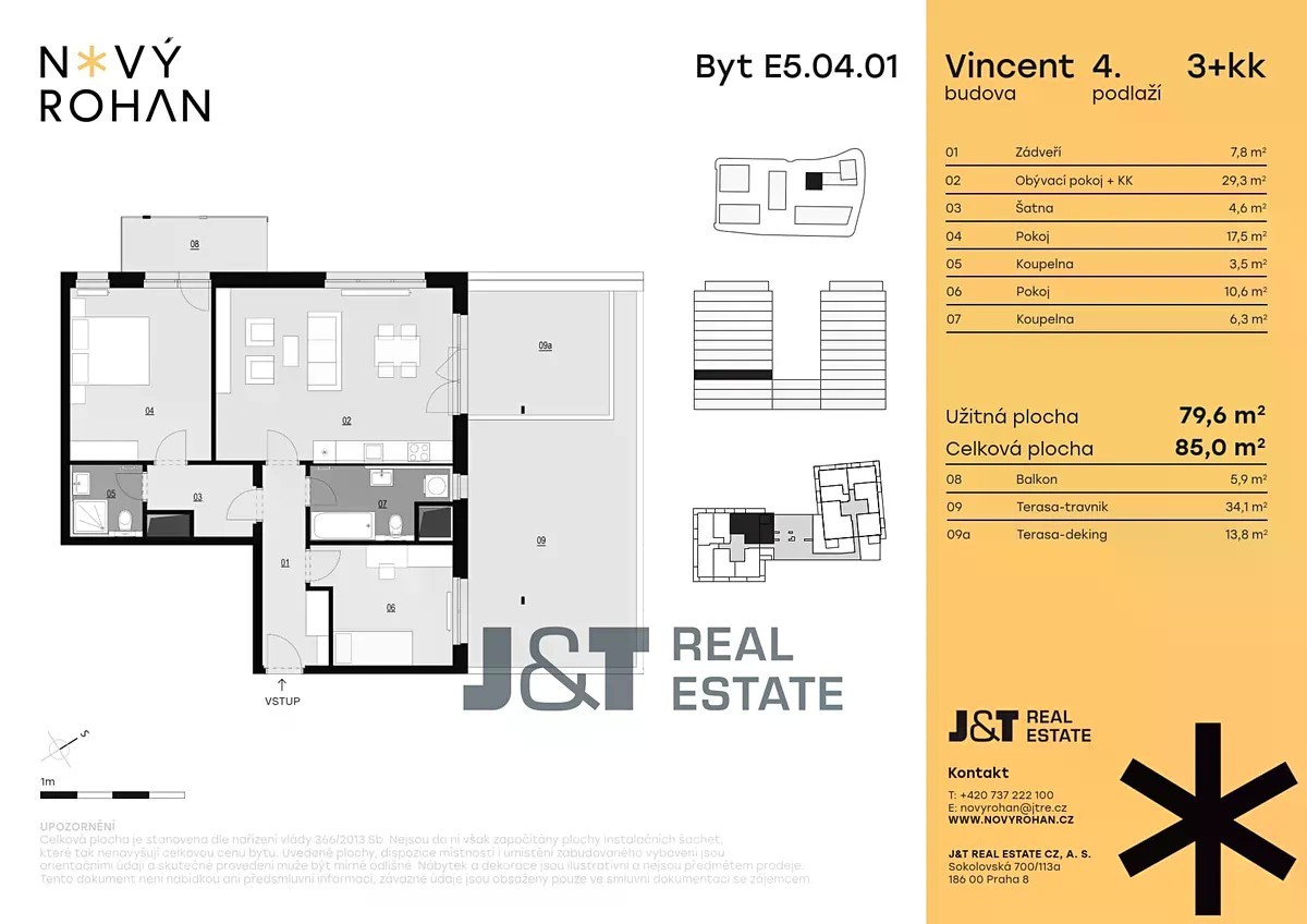 V unikátním rezidenčním projektu Nový Rohan, který vyrůstá v jedné z nejatraktivnějších částí pražského Karlína, nabízíme moderní byt 3+kk o výměře 85 m². Tento byt zaujme nejen svou promyšlenou dispozicí, ale především velkorysým venkovním prostorem, který nabízí maximální komfort pro každodenní život i chvíle odpočinku. Dominantou interiéru je prostorný obývací pokoj s kuchyňským koutem o rozloze 29,3 m², který přirozeně navazuje na soukromou terasu o výměře 48 m² - ideální místo pro letní stolování, relaxaci na lehátku nebo vytvoření vlastní městské zahrady. K bytu dále náleží dva pokoje - jeden o velikosti 17,5 m² vhodný jako hlavní ložnice, druhý s rozlohou 10,6 m², který může sloužit jako dětský pokoj, pracovna nebo pokoj pro hosty. Příjemným bonusem je i další venkovní prostor v podobě balkonu, který ještě více umocňuje propojení interiéru s exteriérem. Byt se nachází v lokalitě, která spojuje městský život s přírodou. Díky strategickému umístění projektu Nový Rohan budete mít doslova vše po ruce - od škol a obchodů přes kavárny až po chystaný metropolitní park Maniny, který nabídne desítky hektarů zeleně pro sport, procházky i relaxaci. Součástí bytu je také sklep a možnost přikoupení parkovacího místa. Karlín se právem řadí mezi nejvyhledávanější čtvrti v Praze - díky své atmosféře, výborné dopravní dostupnosti, kulturním možnostem i blízkosti centra. Pokud hledáte prostorné, klidné a přitom městské bydlení s nadstandardním venkovním prostorem, tento byt je tou pravou volbou. Předpokládaný termín dokončení domů Prokop a Vincent je plánován na konec roku 2027, nastěhování do poloviny roku 2028. V projektu najdete mnoho dalších bytů jak o výměře 4+kk, tak i v dalších výměrách i v různých patrech a domech. Pro více informací neváhejte kontaktovat makléře.