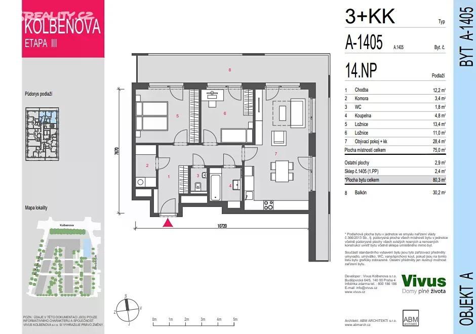 Byt s velkorysým balkonem se nachází v právě budované třetí etapě projektu VIVUS KOLBENOVA. Součástí této etapy budou kromě bytů také komerční jednotky. Již v etapě následující je počítáno kromě jiného také se supermarketem. Nová dominanta Prahy 9 s patnácti nadzemními podlažími vzniká jen pár kroků od vstupu do stanice metra Kolbenova. Nadstandardní vybavení bytu počítá mj. s dřevěnými třívrstvými podlahami či instalovaným venkovním stíněním. Do druhého až osmého nadzemního podlaží domu jsou orientovány menší byty o dispozicích 1+kk a 2+kk. Naopak do ustoupené části (která začíná v 9.nadzemním podlaží) jsou umístěny byty většího charakteru s dispozicemi 3+kk nebo 4+kk. Samozřejmostí je sklep, který je zahrnutý v ceně bytu. Garážové stání není zahrnuto v ceně bytu.