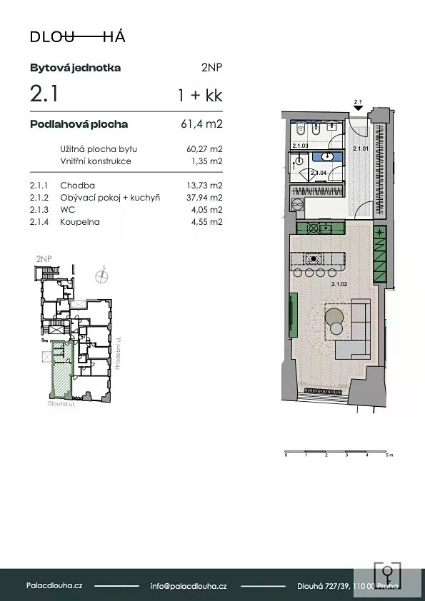 Představujeme vám jedinečný byt 1+kk o celkové ploše 61 m² v samotném srdci historické Prahy. Tento byt je dokonalou symbiózou historické elegance a moderního luxusu, který uspokojí i ty nejnáročnější klienty. Byt prošel citlivou rekonstrukcí s důrazem na detail. V bytě je položena dubová podlaha, instalovány kazetové dveře s ručně zpracovaným mosazným kováním, podtrhující noblesní charakter interiéru, a repliky špaletových oken s protihlukovým sklem, nabízející maximální komfort a klid v centru Prahy. Moderní koupelna kombinuje nadčasový design s funkční dokonalostí (Duravit, Artceram a Gessi), přičemž prostorná, akrylátová vana a sprchový kout s velkoformátovými keramickými obklady pak dotváří příjemný prostor pro relaxaci. Byt je vybaven centrálním vytápěním s designovými tělesy Zehnder, rekuperačními a chladícími jednotkami. Pro zajištění bezpečnosti slouží zabezpečovací systém Jablotron s videotelefonem Legrand. V bytě je dokončena příprava na optický internet. Palác Dlouhá se nachází jen pár kroků od Staroměstského náměstí a Prašné brány. V okolí najdete gastronomické skvosty v podobě vyhlášených restaurací a kaváren; luxusní butiky a obchodní domy; řadu kulturních památek, divadlo přímo v budově. Pro milovníky relaxace je tu Vltavská náplavka a malebné historické uličky Starého Města. Díky skvělé dopravní dostupnosti je vše doslova na dosah ruky - metro, tramvaje i pěší trasy vedoucí do všech koutů Prahy. Stanice metra Náměstí Republiky a tramvajová zastávka Dlouhá třída jsou za rohem; Masarykovo a Hlavní nádraží jen několik minut pěšky. Tento byt není jen prestižním místem k bydlení, ale také mimořádnou investiční příležitostí. Luxusní nemovitosti v centru Prahy patří mezi nejžádanější a nejhodnotnější na trhu, ať už pro dlouhodobý pronájem, nebo jako reprezentativní rezidence. Domluvte si soukromou prohlídku ještě dnes a objevte jedinečný potenciál tohoto exkluzivního bytu. Vaše nové, luxusní bydlení v Paláci Dlouhá čeká právě na Vás. Tento byt je jedním z deseti, které v Paláci Dlouhá nabízíme. Rádi Vám ukážeme vzorový byt.
