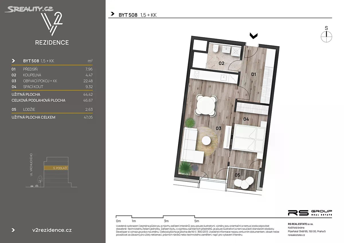 V2 rezidence - kde se hodnota bydlení násobí. Hledáte svůj první byt, nebo chytrou investici? V projektu V2 rezidence v pražských Košířích najdete nové byty od 1+kk po 3+kk v klidné čtvrti, ale jen kousek od centra. Projekt nabízí jedinečnou flexibilitu. Můžete si zvolit byt kompletně vybavený nábytkem i doplňky a rovnou se nastěhovat nebo jej začít pronajímat. Anebo vybrat základní standard a interiér si zařídíte podle vlastního vkusu. Nabízený byt o dispozici 1,5+kk a velikosti 46,67 m² je umístěn v 5. patře a jeho součástí je lodžie o velikosti 2,63 m². K bytu je možné dokoupit sklepní kóji a parkovací stání (cena není zahrnuta do ceny inzerátu). Lokalita nabízí vše potřebné a zároveň výborné spojení s centrem. Na tramvaj Klamovka dojdete za tři minuty a za čtyři minuty jízdy jste na metru Anděl. V okolí nechybí obchody, služby ani parky pro odpočinek. Využít můžete výhodné financování v poměru 10/90. Pro koupi bytu vám tedy stačí počáteční investice ve výši pouhých 10 % z kupní ceny (zbytek až po podpisu kupní smlouvy). V rezidenci vznikne celkem 57 moderních bytů, z nichž každý disponuje balkonem, lodžií či terasou.