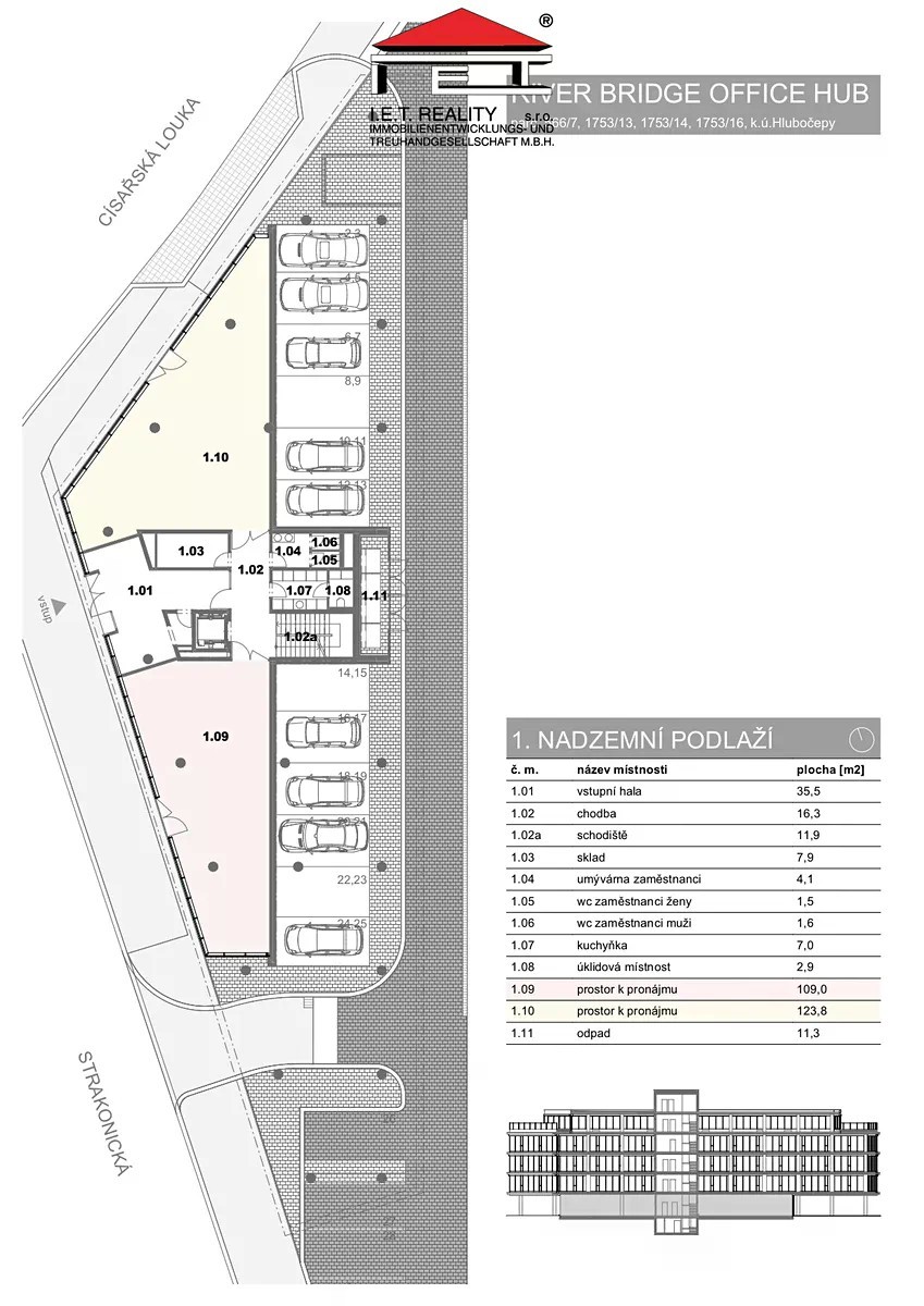 Dovolujeme si Vám nabídnout nové moderní obchodní prostory v přízemí na Praze 5 - Hlubočepy, v blízkosti Dvoreckého mostu, který v dohledné době propojí oba břehy řeky Vltavy. Prostory č. 1.09 o celkové výměře 109 m2 se nachází v přízemí administrativní budovy na břehu řeky Vltavy, která se stane součástí areálu River Business Centre. Je možné k nim využívat sociální zázemí o velikosti 66 m2, které se nachází na patře. Služby spojené s užíváním prostorů jsou stanovené na cenu 140 Kč za m2 plochy pronájmu. Areál disponuje recepcí, včetně obsluhy, ostrahou objektu 24/7, výtahem a skvělou dopravní dostupností - navazuje na Strakonickou a pouze pár metrů od kanceláří se nachází zastávka MHD Lihovar. Areál nabízí také parkovací místa - jedná se o krytá i venkovní parkovací stání v areálu a okolí. První měsíce jsou za zvýhodněné nájemné, tedy pouze za 7,99 EUR/m2/měsíc. Volné od 1.3.2026 k nastěhování. Je možné také pronajmout celé patro. Provizi RK neplatíte.