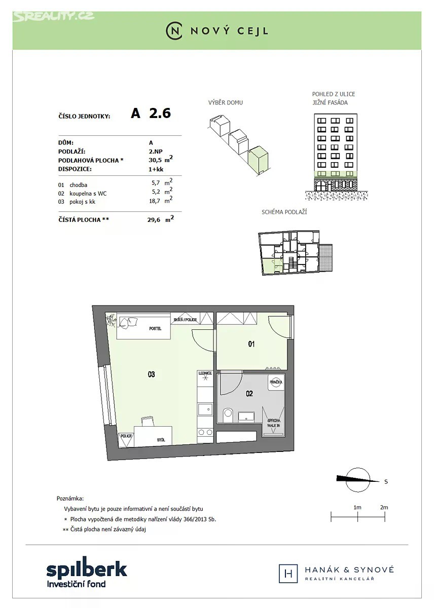 Jste zvyklí bydlet luxusně a bez starostí a pár kroků do centra města? Chcete bydlet v úplně novém bytě, ve kterém před Vámi ještě nikdo nebydlel? K dlouhodobému pronájmu Vám nabízíme nový, krásný, světlý, moderní ateliér 1+kk v osobním vlastnictví v novostavbě bytového domu na ulici Cejl, Brno. Ateliér o ploše 30,4 m2 je umístěn ve 2.NP cihlového domu s výtahem a je orientován na jih. K ateliéru je možné za příplatek pronajmout parkovací stání. Výhody ateliéru: •Prostorný interiér: Efektivně využitý obytný prostor o rozloze 30,4 m² vhodný pro 2 osoby •Funkční kuchyň: Vybavena následujícími spotřebiči: indukční deska, lednice s mrazákem, mikrovlnná trouba. •Obytná plocha: Hlavní místnost je připravena pro obývací i spací zónu včetně postele s matrací o rozměru 160x200 cm. •Prostorná moderní koupelna: Koupelna se sprchovým koutem, podsvíceným zrcadlem, toaletou a pračkou •Kvalitní okna: Francouzská plastová okna s izolačním trojsklem •Úložné prostory: Vestavěné skříně poskytují dostatek úložného prostoru •Elektricky stahovatelné venkovní žaluzie Vám zajistí teplený komfort a pocit soukromí Výhody bytového domu: •Uzavřený klidný vnitroblok •Velkorysé společné prostory •Kolárna •Udržovaná zeleň •Zelené střechy •Nízké provozní náklady (energetická třída B, velmi úsporná) •Napojen na optický kabel. Internet není součástí nákladů za služby, nájemník si zřizuje připojení k internetu samostatně. Výhody lokality: •Blízkost centra města •Na Malinovského náměstí jste tramvají za 5 minut, na Hlavním nádraží za 11 minut •Na cyklostezce podél řeky Svitavy jste za 5 minut pěšky •Tramvajová zastávka je 2 minuty chůze od domu •V areálu Nové Zbrojovky jste na kole/koloběžce po cyklostezce za 7 minut Nájem je možný od 1.1.2026, výše měsíčního nájmu činí 12.990 Kč/měsíčně, přičemž cena je uvedena bez záloh na služby. Zálohy na služby jsou 3.000,- Kč/měsíčně a zahrnují zálohy na vodné/stočné, teplovodní vytápění a elektřinu spotřebovanou v bytě. Vratná kauce je ve výši 30.000,- Kč. Provize realitní kanceláři je ve výši jednoho nájmu (12.990,- Kč + DPH). Pronájem je vhodný pro jednotlivce, či pár, maximálně však pro 2 osoby. Byt je striktně nekuřácký. Pro více dotazů jsme Vám k dispozici. Za poplatek je v bytě kvartálně prováděn pravidelný úklid. Neváhejte a využijte tuto jedinečnou příležitost k pronájmu moderního bytu, který se může stát vaším novým domovem. Kontaktujte nás ještě dnes a domluvte si prohlídku, abyste mohli zažít komfort městského bydlení v rezidenci Nový Cejl!