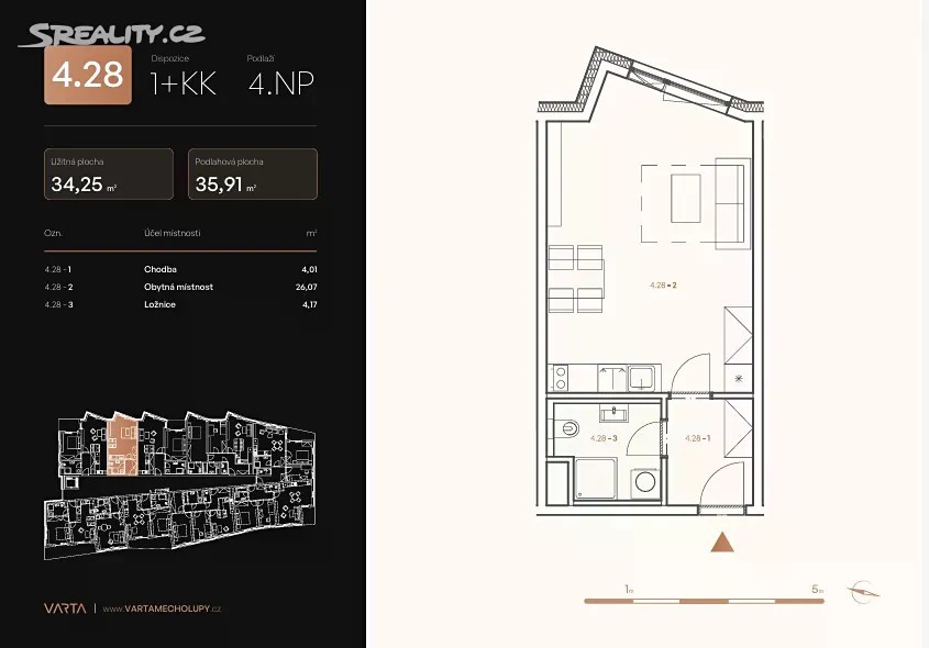 Exkluzivní nabídka - moderní byt 1+kk v projektu VARTA Měcholupy, Praha 10 Hledáte moderní a klidné bydlení s výbornou dostupností do centra Prahy? Pak vás jistě zaujme tento slunný byt 1+kk (35,91 m²), který se nachází v 4. nadzemním podlaží nového rezidenčního projektu VARTA Měcholupy na rohu ulic Boloňská a Milánská. Součástí nabídky je možnost dokoupení sklepa (od 160 000 Kč). Projekt VARTA Měcholupy představuje komorní rezidenci s důrazem na komfort, kvalitu a úspornost provozu. Příprava na fotovoltaiku, nadstandardní materiály a zpracování, dostatek parkovacích i sklepních prostor, zeleň a klidné prostředí v okolí domu. Lokalita Horní Měcholupy nabízí ideální kombinaci klidného bydlení a skvělé dopravní dostupnosti. V blízkosti najdete kompletní občanskou vybavenost - školy, školky, obchody, restaurace i zastávky MHD. Byt je ihned k nastěhování.