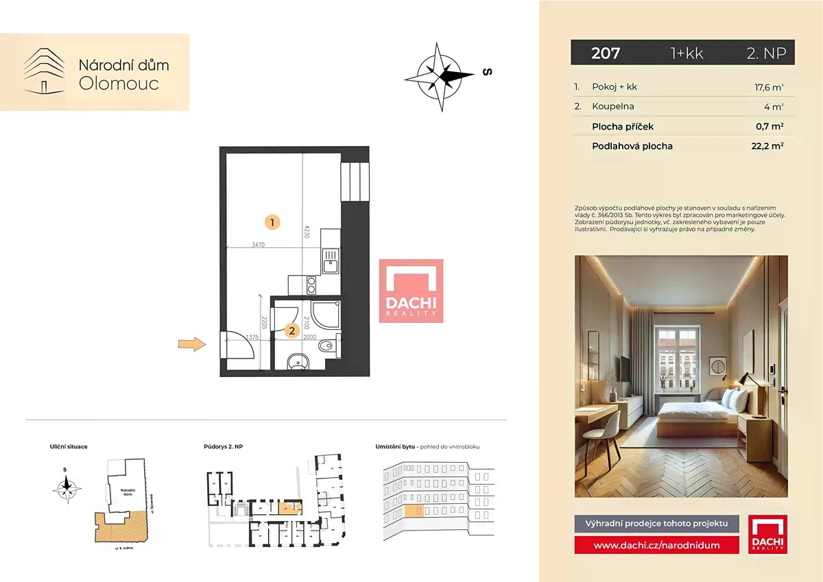Nabízíme vám jako výhradní prodejce jedinečnou příležitost stát se součástí unikátního rezidenčního projektu, který vdechuje nový život architektonicky cenné budově historického Národního domu v Olomouci. Tento ikonický dům vstupuje do nové éry - v jeho prostorách vznikají desítky moderních bytových jednotek, které citlivě propojují historické kouzlo s komfortem současného bydlení. V rámci projektu nabízíme byt č. 207 o dispozici 1+kk s podlahovou plochou 22,2m², který se nachází ve 2. nadzemním podlaží. Byty jsou navrženy s důrazem na kvalitu, eleganci a funkčnost - samozřejmostí jsou kvalitní podlahy, designové interiérové prvky a moderně vybavené koupelny. Všechny byty ve 2. nadzemním podlaží disponují velkými okny, které interiér zaplavují denním světlem a nabízejí působivý výhled na dění v centru města. Pod okny jsou umístěny stylové dřevěné kryty radiátorů s mřížkami, které zároveň vytvářejí příjemné posezení - ideální místo pro odpočinek s knihou, ranní kávu nebo pozorování pulzujícího života historické Olomouce. Historický Národní dům byl od svého vzniku dějištěm významných společenských a kulturních událostí, jichž se účastnily přední osobnosti českých dějin, včetně T. G. Masaryka. Díky tomu má celý objekt nezaměnitelnou atmosféru a historický odkaz, který dodává novému bydlení jedinečný charakter. K výjimečné atmosféře domu přispívá také stylová kavárna a restaurace v přízemí, které vytvářejí příjemné zázemí nejen pro rezidenty, ale i jejich hosty. Díky prestižní poloze v samotném centru města, v těsné blízkosti památek, oblíbených restaurací a kulturních institucí, představuje projekt nejen komfortní místo pro život, ale také mimořádně atraktivní investiční příležitost. Hledáte-li byt s jedinečným charakterem v historickém domě, kde se noblesní atmosféra minulosti snoubí s moderním stylem života, neváhejte nás kontaktovat. Rádi vám projekt osobně představíme.