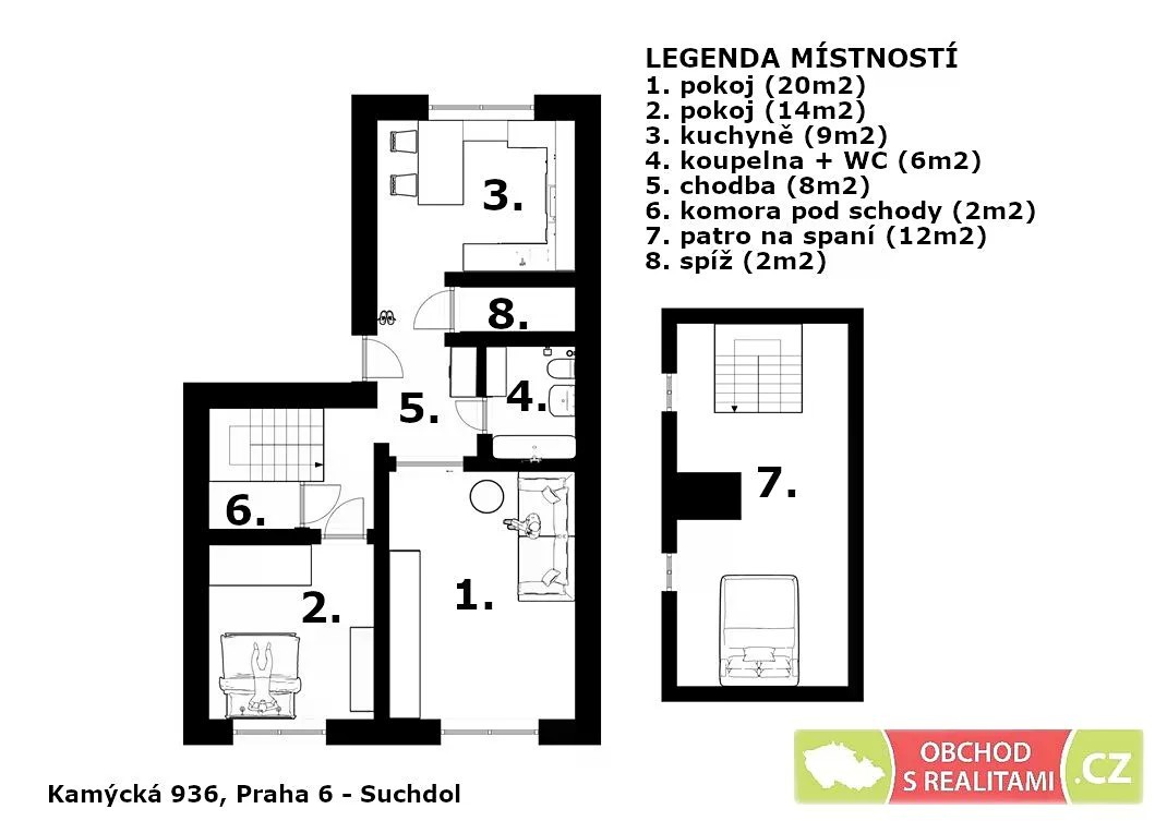 Bytová jednotka se nachází na adrese Kamýcká 936/77, Praha 6 (Suchdol), v těsné blízkosti zastávky BUSu Zemědělská univerzita. Cesta na metro trasy A Dejvická trvá 10 minut (vysoká frekvence spojů po celý den). V blízkosti domu je mnoho příležitostí k nákupu, dále je v místě mnoho příležitostí k veřejnému stravování (restaurace, bistra apod.); byt se nachází v centrální části Suchdola, vedle Brandejsova nebo Suchdolského náměstí. Dispozice bytu je 2+1 + podkrovní vestavba. Byt nabízí dostatek úložných prostor v podobě velké komory u kuchyně (spíže) a komory pod schody do podkroví. Dále se v bytě nachází mnoho úložných prostor na míru. Dispoziční plány bytu přikládáme. Byt může zůstat vybavený dle přiložené fotodokumentace, jedná se o nábytek na míru i plně vybavenou kuchyňskou linku (včetně myčky nádobí, kombinované chladničky, indukční varné desky, odsavače par, pečící trouby i vestavěné mikrovlnné trouby). Místo pro pračku je ve vestavěné skříni v předsíni, pračku si dodává nájemce svépomocí. Byt má vlastní plynový kotel, s teplem a teplou vodou si tak nájemce hospodaří samostatně. K dispozici jsou též dvě klimatizační jednotky. Vstupní dveře jsou bezpečnostní. Bytový dům je v dobrém stavu, společné prostory jsou čisté; v loňském roce byla přeložena střešní krytina včetně nové tepelné izolace. V domě jsou k dispozici kolárna / kočárkárna i sušárna. Dle posledního ročního vyúčtování činila spotřeba plynu 650 Kč / měsíc, spotřeba elektřiny 1.400 Kč / měsíc, spotřeba energií se převádí na nájemce. Záloha na služby v domě je 1.400 Kč (pro max. 2 osoby), při jiném počtu osob bude záloha upravena. Nájemné 26.400 Kč, jistota (kauce) 35.000 Kč, odměna realitní kanceláře jedno měsíční nájemné.
