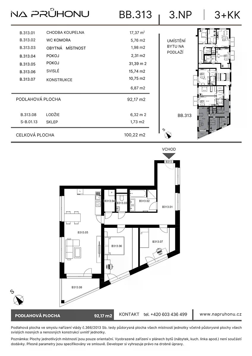 Velkorysý 3+kk s lodžií a chlazením | 92 m² v moderní rezidenci u centra Plzně Hledáte bydlení, které má prostor, klid a přitom vše po ruce? Byt BB 313 v projektu Bytové domy Na Průhonu Plzeň vás nadchne. Dispozice 3+kk, výměra 92,17 m² + lodžie 6,32 m² 3. nadzemní podlaží s výtahem Možnost parkovacího stání Energetická třída A - mimořádně úsporný byt Tepelné čerpadlo + podlahové chlazení i vytápění Komfort, soukromí a kvalita v každém detailu Byt byl navržen tak, aby poskytoval maximum soukromí a pohodlí. Efektivní dispozice, vinylové podlahy, velkoformátové obklady Ecoceram, příprava pro venkovní žaluzie a nadstandardní tepelná pohoda i v létě díky chlazení. Vytápění a chlazení zajišťuje moderní tepelné čerpadlo s podlahovým rozvodem, které nabízí nejen komfort, ale také reálnou úsporu energií až o 40 % oproti běžným systémům. Férové financování: 10 % při podpisu 90 % až po kolaudaci Pomoc se zajištěním hypotéky Bezpečné a pohodlné parkování Ke každému bytu nabízíme možnost venkovního parkovacího stání (270 000 Kč), odděleného branou od veřejné komunikace. Lze dokoupit i více míst. Skvělá lokalita - klid a dostupnost Projekt se nachází v klidné části Plzně - Na Průhonu, jen kousek do centra, OC Borská Pole i Skvrňan. MHD i autem snadná dostupnost, kompletní občanská vybavenost v dosahu. V projektu je celkem 49 bytů různých velikostí - podívejte se na naše další nabídky na webu (odkaz v hlavičce inzerátu nebo u makléře). Možnost prohlídky dle domluvy.