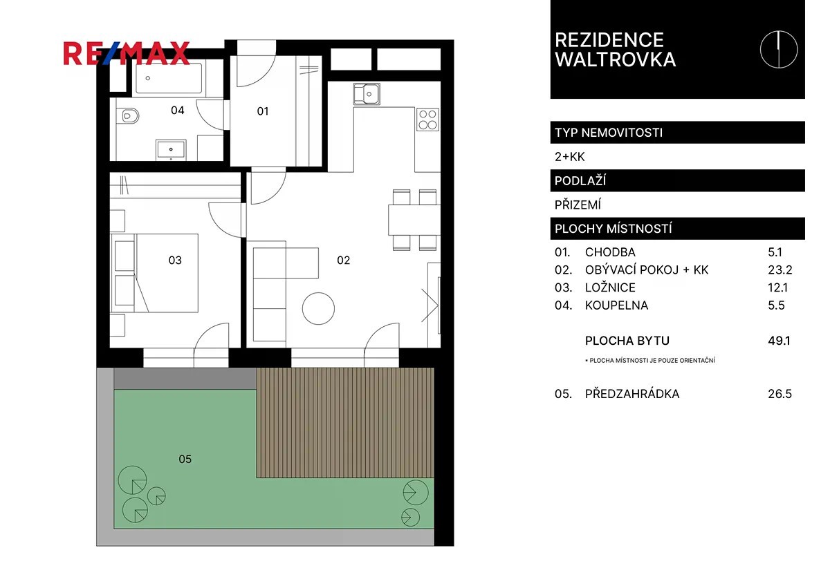 Na prodej nabízíme krásný, světlý a velmi útulný byt o dispozici 2+kk a podlahové ploše 49,1 m² s vlastní zahradou o rozloze 26,5 m² a garážovým stáním. Byt se nachází v přízemí nové rezidenci Waltrovka, dokončené v roce 2019, v žádané lokalitě Prahy 5 - Jinonice. Interiér* bytu je ve výborném stavu, působí jako nový. Dominantou obývacího prostoru jsou velká francouzská okna orientovaná na jih, která zajišťují dostatek světla po celý den. Podlahy tvoří kvalitní laminát, v bytě je instalována nová kuchyňská linka s moderními spotřebiči. V koupelně se nachází prostorná vana, v ložnici velká vestavěná skříň poskytující dostatek úložného prostoru. Součástí prodeje je garážové stání v suterénu domu. Rezidence Waltrovka od Penta Real Estate je jedním z nejkvalitnějších nových projektů v Praze. Nabízí moderní architekturu, výbornou údržbu společných prostor, množství zeleně a pocit klidu, který je v metropoli vzácností. Na hlavním náměstí projektu najdete ikonické sochy Davida Černého, které se staly uměleckým symbolem celé čtvrti. Prostředí Waltrovky je ideální pro rodiny - v okolí se nacházejí dětská hřiště, mateřské i základní školy, kavárny, restaurace a obchody. Dopravní dostupnost je vynikající - v docházkové vzdálenosti je stanice metra Jinonice (linka B), autobusové zastávky i cyklostezka. Centrum města je dostupný během 10 minut. Tichá, bezpečná a zelená čtvrť Waltrovka nabízí kombinaci moderního bydlení, příjemného sousedství a pocitu domova, který si zamilujete hned při první návštěvě. *Vizualizace vygenerované AI