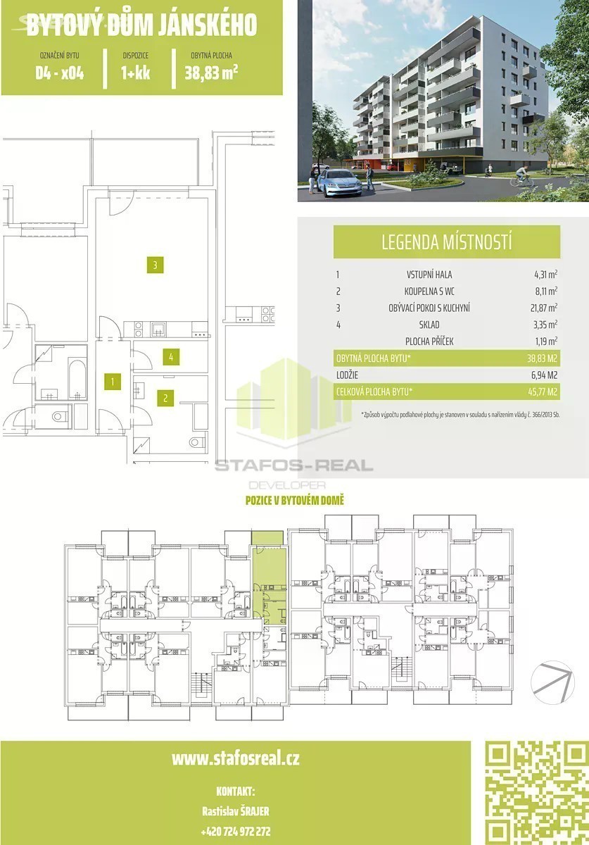 Představujeme vám jedinečnou příležitost k pronájmu novostavby moderního bytu 1+kk s užitnou plochou 38,83 m2 a lodžií o rozloze 6,94 m2. Tento byt se nachází v 4. nadzemním podlaží kvalitní novostavby, která bude dokončena na přelomu září/říjen 2025. Těšit se můžete na prestižní lokalitu na ulici Janského, v oblíbeném olomouckém obvodu Povel. Lokalita je ideální pro každodenní život, ať už kvůli blízkosti centra města, Fakultní nemocnice či dálničního příjezdu do Olomouce, tak díky snadné dostupnosti širokého spektra obchodů, služeb a dopravních spojení. Vaše nové bydlení nabídne severozápadní orientaci a prostorný obývací pokoj s kuchyňským koutem a vstupem na lodžii. Součástí bytu je také samostatná šatna a koupelna s toaletou. Interiér je dokonalý až do detailu - vinylovou podlahu doplňují okna s trojsklem, moderní keramické obklady a dlažba v koupelně, či klimatizace u vybraných bytů a vnitřní žaluzie. Výjimečnost tohoto bydlení dokreslují prvotřídní služby a zařízení objektu. Tento bytový dům patří do energetické třídy B, což znamená nižší náklady na bydlení. Dům také nabízí komfortní řešení zvukového a tepelného útlumu mezi byty i oddělení chodeb od výtahu, bezbariérový přístup, moderní výtah, vysokorychlostní internet a mnoho dalšího. Nájemné činí 13.100,- Kč/měsíc plus náklady na bydlení cca 1.400,- Kč až 1.600,- Kč a elektřinu. Byt se pronajímá nevybavený, součástí je kuchyňská linka se spotřebiči a lednicí s mrazákem. Kauce je ve výši dvou měsíčních nájmů, s možností rozdělení na dvě splátky. K bytu je také možnost pronajmout jednu ze čtyř variant parkovacích stání a také sklep, obojí dle dostupnosti. Odměna RK ve výši jednoho nájmu + 21% DPH. Začněte Vaší novou životní kapitolu bydlení a vychutnejte si radost z bydlení v zbrusu novém bytě. Prověřujeme evidenci exekucí, insolvencí a dluhů na zdravotním pojištění našich potenciálních nájemníků. Pro lepší představu o tomto bydlení vám doporučujeme shlédnout virtuální prohlídku, která vám také poskytne možnost změřit jakýkoliv rozměr tohoto bytu. Volné od listopadu/prosince 2025. Kompletní výběr bytů v tomto domě najdete v kartě projektu a na našich stránkách.