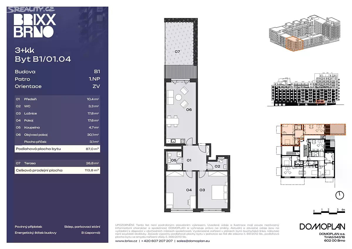 Staňte se součástí nové brněnské čtvrti, která přináší vše podstatné pro život na jednom místě -moderní bydlení, příjemné prostředí i komunitní atmosféru v projektu, který má ambici stát se novým srdcem Starého Lískovce. Nabízíme vám ke koupi bytovou jednotku B1/01.04 o dispozici 3+kk se zahrádkou v rámci nového projektu BRIXX od DOMOPLANu. Projekt vyrůstá v žádané lokalitě Starého Lískovce, přímo naproti univerzitnímu kampusu a Fakultní nemocnici Brno - Bohunice. Místo, které spojuje skvělou dopravní dostupnost, kompletní občanskou vybavenost i klidnou rezidenční atmosféru. Součástí areálu bude kompletní městské zázemí - obchody, kavárny, služby i prostory pro relaxaci a sport. BRIXX nabídne svým obyvatelům moderní čtvrť s aktivním městským životem, která přitom myslí i na dostatek zeleně, soukromí a bezpečí. Stylový byt s promyšlenou dispozicí a vzdušným interiérem je navržen tak, aby splnil nároky současného městského života. Prémiové služby pro rezidenty. Na detailech záleží - proto jsou v základním standardu zahrnuty vícevrstvé dřevěné podlahy, hliníková okna s izolačním trojsklem, dálkově ovládané screenové rolety a velkoformátové obklady. Díky subtilním rámům oken proudí do interiéru maximum denního světla, zatímco kvalitní materiály a izolace zajišťují komfort v zimě i v létě. Energetická úspornost a komfort: • Nadstandardní tepelná izolace vnějšího pláště budovy, hliníková okna s trojskly a venkovní screenové rolety snižují spotřebu tepla, brání přehřívání a zajišťují příjemné klima po celý rok. • Úsporné technologie a ekologický systém vytápění a chlazení s centrálním zdrojem přinášejí energetický štítek kategorie B - velmi úsporná. • Zelené střechy a vzrostlá zeleň ve vnitrobloku vracejí přírodu do města, zlepšují mikroklima, hospodaří s dešťovou vodou a omezují vznik tepelných ostrovů. Komunitní zázemí: • Komunitní zahrada s možností pěstování bylinek nebo zeleniny na střeše domu B.9. • Zahrada se vzrostlou zelení a grilovacími místy ve vnitrobloku - prostor pro setkávání i odpočinek. • Bezkontaktní přístupový systém a kamerový dohled zajišťují maximální bezpečí rezidentů. V navazující etapě výstavby nabídne areál i exkluzivní služby určené výhradně obyvatelům: • Concierge recepci 24/7 s úschovnou zásilek a lednicemi pro potraviny. • Lobby se sdíleným prostorem pro práci a schůzky. • Wellness s terasou, přístupné pouze rezidentům. • Rodinné kino. • Prostor pro mytí kol i domácích mazlíčků, společné kolárny a kočárkárny. • Komerční jednotky v přízemí domů s nabídkou služeb pro každodenní potřeby.