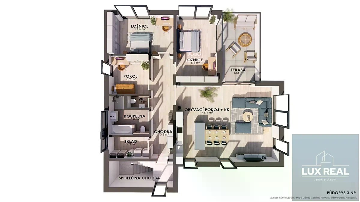 V rámci projektu Nové Šlapanice, který vyrůstá na začátku Šlapanic si Vám dovolujeme představit výjimečné a na danou lokalitu ojedinělé bydlení. Novostavba představuje ideální místo pro ty, kdo hledá kvalitní, moderní, prostorné a dispozičně chytře řešené bydlení. Byty mají terasy, vlastní zahrady, parkovací stání a garáž. Jedná se o 1. etapu v tomto projektu na nově vznikající ulici Libuši Šafránkové. V této etapě nabízíme prodej 3 bytových jednotek., Byt č. 3 “, který se nachází v 3.NP je dispozičně řešen jako 4+kk o velikosti 114 m2 a s terasou 12m2. K bytu náleží garáž 15m2 a 1 parkovací stání. Standarty bytu, které jsou součástí kupní ceny: - podlahy vinyl, keramická dlažba - sanitární technika, sprchový kout, včetně sprchového setu, umyvadlo včetně baterie, závěsné WC, zrcadlo. - interiérové dveře + obložkové zárubně, posuvné dveře - podlahové vytápění, topné těleso Samotná lokalita nabízí širokou škálu pracovních možností a veškerou potřebnou občanskou vybavenost a výbornou dojezdnost díky dálnici D1 a D2. Také zde v docházkové vzdálenosti nalezneme školu, školku, řadu obchodů, restaurací a služeb, trolejbusovou zastávku, ale především vlakové nádraží, z kterého jste na Hlavním vlakovém nádraží v Brně va 15 min. Dokončení bytů je plánované na konec roku 2026. Výhodou je model financování nemovitosti. Pokud by Vás nabídka tohoto či jakéhokoliv jiného bytu v tomto projektu zaujala, kontaktujte prosím makléře, u kterého se dozvíte více. Děláme moderní bydlení dostupnější.