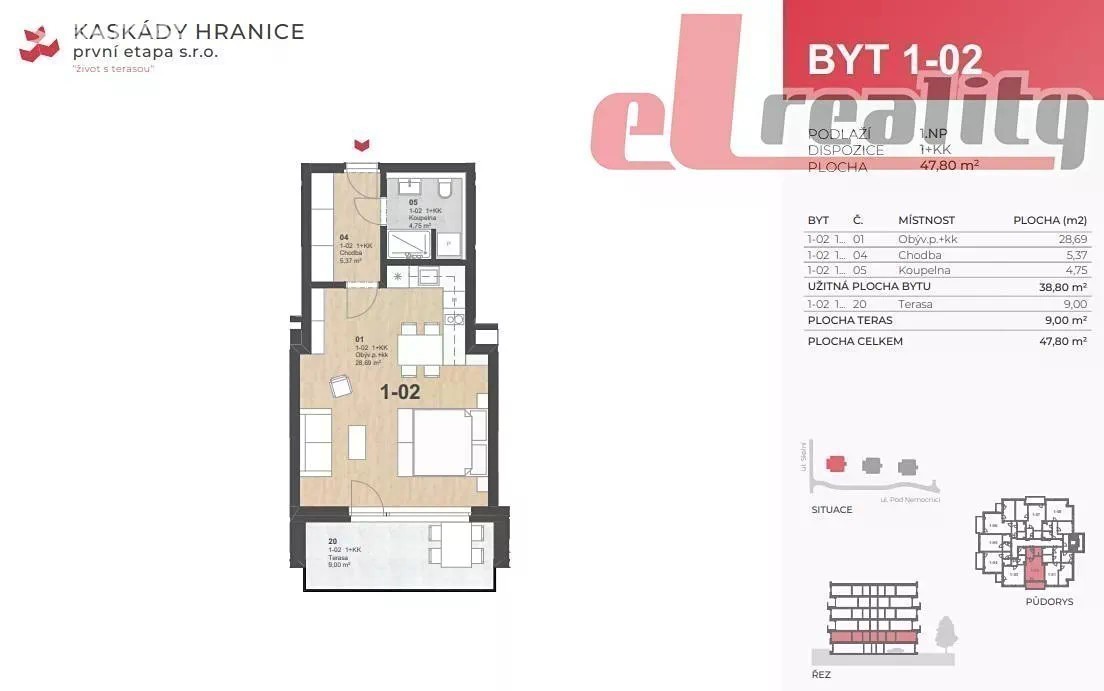 Naše společnost Vám zprostředkuje pronájem bytu 1+kk v 1. NP (v přízemí) cihlového domu. Podlahová plocha bytu je 47 m2. Byt po kompletní rekonstrukci a zařízený. Nová kuchyňská linka s vestavěnými spotřebiči (např. myčka a lednička). Podlahy plovoucí a keramická dlažba. V koupelně umyvadlo WC a vana. K bytu náleží sklep a terasa. Více informací u makléře.