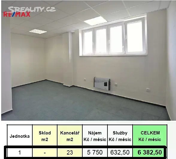 Nabízíme pronájem malé kanceláře/skladu v 4.patře v budově B7 (rampa, nákladní výtah) v Areálu BigBox Horní Počernice. Rozměry kanceláře/skladu - 23 m2, k dispozici od 02/2026. Na patře kuchyňka, toalety. Měsíční nájemné - 5.750,-Kč/měsíčně + služby 632,50,- Kč/měsíčně + DPH; elektřina dle skutečné spotřeby, nájemné měsíčně předem.