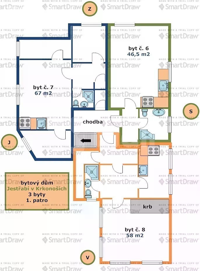 Ve výhradním zastoupení nabízíme k prodeji byt v osobním vlastnictví o dispozici 1+kk a výměře 27 m2 v apartmánovém domě v Krkonoších a to v klidné části obce Jestřábí v Krkonoších (v blízkosti ski areálu Vítkovice a Benecko). Jedná se byt umístěný v prvním patře zděného domu a náleží mu samostatná vybavená kuchyň, koupelna se sprchovým koutem a WC, pokoj. K bytu náleží sklep v přízemí, kde je také umístěna společná společenská místnost. U domu k dispozici parkovací místo a také prostorná grilovací zóna. Tato jednotka je vhodná pro vlastní rodinnou rekreaci, ale také pro krátkodobý komerční pronájem. V případě zájmu o prohlídku kontaktujte makléře, s financováním pomůžeme.