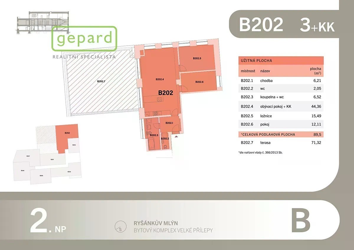 Realitní společnost Gepard nabízí k prodeji byt v OV 3+kk, 89,6m2 s terasou 71,3m2 byt č. B202) v developerském projektu Ryšánkův mlýn ve Velkých Přílepech vzdálených od Prahy pouhých 6km a 15min autem. Byty v budově B jsou dokončené ve vysokých standardech jako např. plasto-hliníková okna v budově B, podlahy 1.NP vinylové, 2. a 3.NP třívrstvé dřevěné podlahy v barvě dubu, byty jsou vybaveny kvalitní kuchyňskou linkou se spotřebiči Elektrolux a osvětlením, obojí v ceně. Vytápění je zajištěno společnou plynovou kotelnou v budově. K dispozici je venkovní parkovací stání za 224.000Kč. Budova je zkolaudovaná. Projekt Ryšánkův mlýn zahrnuje dvě zrekonstruované budovy propojené společným vchodem. Původní stavba z 19. století disponuje devíti byty s maximálně možným zachováním dobových prvků od 1kk po 3kk. Druhá budova v industriálním stylu nabízí 16 bytů. Jsou zde i byty se zahrádkou, terasou nebo balkonem. Všechny byty mají sklepní kóji. Velké Přílepy disponují plnou občanskou vybaveností, spojení MHD na metro Bořislavka a Dejvická. Podlahová plocha je uvedená dle nařízení vlády č. 366/2013Sb, tzn. včetně příček. Pro klienty tohoto projektu zajistíme výhodné podmínky financování a případný prodej Vaší stávající nemovitosti. Sjednejte si prohlídku a využijte možnosti výběru bytu ve zcela novém projektu.