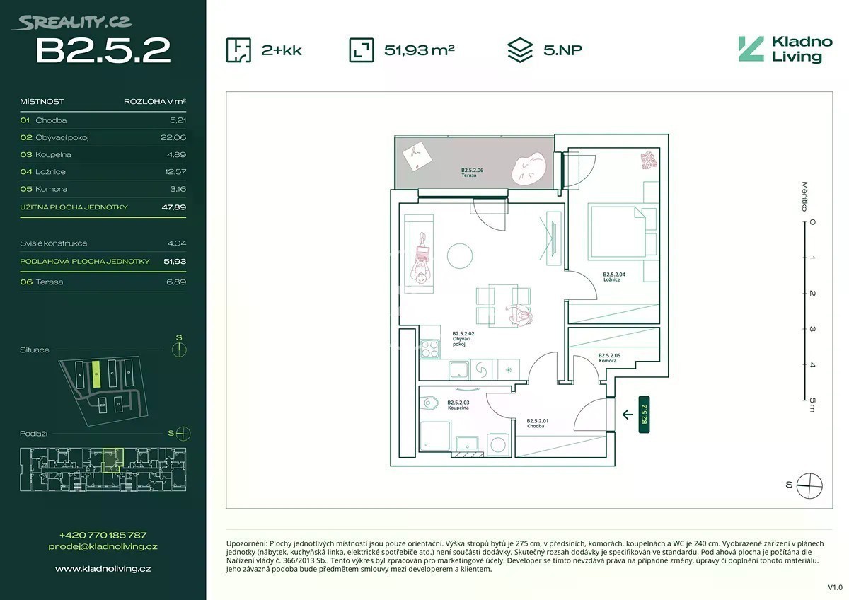 Nabízíme ke koupi moderní byt 2+kk o podlahové ploše 51,9 m² s terasou 6,9 m² v rezidenčním projektu Kladno Living, který vzniká v jedné z nejatraktivnějších lokalit města Kladno - Kročehlavy. Tento nový developerský projekt představuje jedinečnou příležitost pro ty, kteří hledají nové byty v Kladně nebo investici do nemovitosti s vysokým potenciálem zhodnocení. Projekt Kladno Living tvoří pět elegantních bytových domů (A-E) s celkem 371 jednotkami a nabízí ideální spojení klidného bydlení v zeleni a skvělé dopravní dostupnosti. Rezidenti ocení kromě plné občanské vybavenosti v okolí i vlastní sousedskou zahradu, dětské hřiště, okolní lesopark Nové Boroviny i výborné napojení na Prahu a Letiště Václava Havla. Zastávka MHD Pražská křižovatka se nachází přímo u projektu - do centra Kladna se dostanete během pár minut a na pražské metro Nádraží Veleslavín za přibližně 25 minut. Byty na prodej v Kročehlavech jsou navrženy s důrazem na funkčnost, úsporu energií a maximální komfort. Od útulných 1+kk po prostorné rodinné 4+kk - každý byt disponuje efektivním dispozičním řešením a dostatkem úložného prostoru. Většina jednotek nabízí balkon, terasu nebo předzahrádku, které rozšiřují obytný prostor. Součástí projektu je dostatek parkovacích míst a sklepních kójí. Nízkoenergetický projekt Kladno Living (PENB B) dbá na udržitelnost a moderní technologie - byty disponují rekuperačním systémem, úsporným podlahovým vytápěním a přípravou pro venkovní hliníkové žaluzie. Chybět nebudou fotovoltaické panely ani zelené střechy. Díky těmto řešením nabízí byty zdravé a komfortní vnitřní prostředí s dostatkem přirozeného světla a nízkými provozními náklady. Vysoký standard vybavení zahrnuje kvalitní vinylové podlahy, designové keramické obklady a dlažby (60x60 cm), zvýšené stropy v obývacích místnostech (2 750 mm), plastová okna s izolačním trojsklem, bezfalcové interiérové dveře s magnetickými zámky a kvalitní sanitu s bateriemi značky Gröhe. Kladno Living - moderní bydlení blízko Prahy, kde klid, prostor a pohodlí tvoří nový standard života. Prodej projektu probíhá ve třech etapách. Kolaudace 1. etapy (budovy A a B) je plánována na 2. čtvrtletí roku 2027.