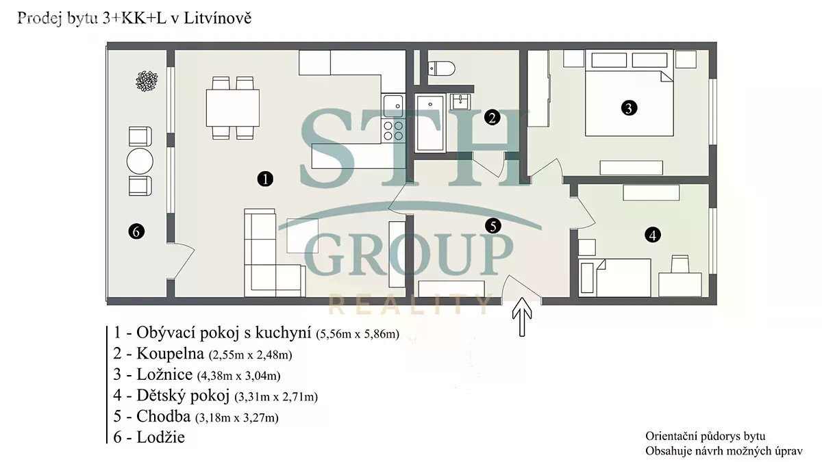 Nabízíme k prodeji byt 3+KK o podlahové ploše 75 m² v osobním vlastnictví, umístěný v 5. patře panelového domu s výtahem v ulici Gluckova, Litvínov - Janov (blok A6). Dům je zateplený a udržovaný, vstup je na čip a ve vchodě žijí dlouhodobě slušní a klidní obyvatelé. Dům se nachází v klidné části sídliště s výhledem do zeleně. Parkování je možné přímo před domem, autobusová zastávka je hned u domu. Součástí bytu je také komora na chodbě o velikosti cca 1,5 m² a sklep o velikosti cca 3 m². Očekávaný a předvídatelný roční výnos cca 7,8 % Byt je udržovaný, čerstvě vymalovaný a připravený k užívání. Koupelna je plně funkční, do budoucna vhodná na modernizaci. Dispozice 3+KK s prostornou lodžií je velmi dobře pronajímatelná Osobní vlastnictví umožňuje rychlý a jednoduchý převod Nízké provozní náklady Páté patro s otevřeným výhledem Obývací pokoj s kuchyní: 5,56 × 5,86 m (32,6 m²) Ložnice: 4,38 × 3,04 m (13,3 m²) Dětský pokoj / pracovna: 3,31 × 2,71 m (9,0 m²) Koupelna: cca 4 m² Chodba: 3,18 × 3,27 m (10,4 m²) Komora na chodbě: 1,5 m² (není součástí podlahové plochy bytu) Sklep: cca 3 m² (není součástí podlahové plochy bytu) Lodžie: cca 7,5 m², jižní orientace, celodenní světlo, výhled na Krušné hory (Lodžie také není započítaná do podlahové plochy bytu.) Dům má výbornou dopravní dostupnost - autobusová zastávka je přímo u domu, s přímým spojením do centra Litvínova. V okolí je kompletní občanská vybavenost: obchod s potravinami, pošta, lékárna, zdravotní středisko, základní a mateřská škola, sportovní areály, dětská hřiště, cyklostezky, park a zeleň. Jedná se o klidný a stabilní vchod bez problémových sousedů a bez rušné silnice pod okny. PENB nebyl dodán, proto prozatím uvádíme třídu G. Nemovitost je v osobním vlastnictví a lze ji bez problémů financovat hypotečním úvěrem, který Vám zdarma pomůžeme vyřídit za nejvýhodnějších podmínek na trhu. V případě zájmu o prohlídku nás kontaktujte. Rádi Vám poskytneme další informace a domluvíme vhodný termín.