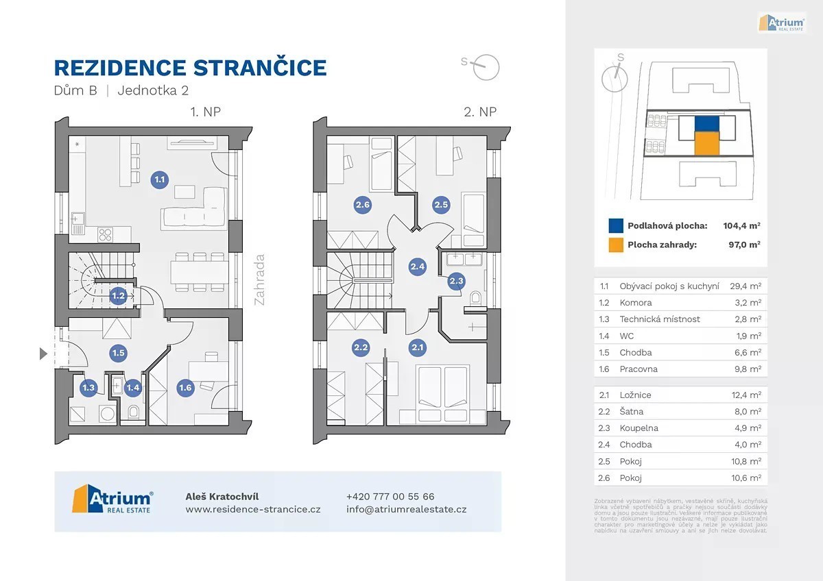 Vítejte na prezentaci nového developerského projektu Residence Strančice v malebné obci nedaleko Prahy. Tento residenční developerský projekt je realizován na klidném místě v širším centru obce Strančice. Dle platného územního plánu se jedná o tři rodinné domy, každý se třemi bytovými jednotkami. Vlastní projekt architektonicky, ale hlavně uživatelsky splňuje funkci řadových rodinných domů. Situovaný je u nového parku, u každé jednotky /bytu/ bude majitel užívat privátní zahradu a v ceně jsou i dvě parkovací stání. Okolí nabízí mnoho rekreačních možností včetně cyklostezek a okolní lesy lákají k procházkám či jinému sportovnímu vyžití. Přijďte objevit moderní a komfortní bydlení v harmonickém prostředí, které kombinuje klid venkova s výhodami městského života s vynikající dopravní dostupností do Prahy. Zahájení výstavby 05/2024, dokončení je plánováno do 08/2026. Vítejte ve Vašem novém domově! Tato konkrétní jednotka s označením B2, o užitné ploše 104,4 m2, se zahradou 97 m2, je ideální variantou pro rodinu s dětmi, kde si budete užívat klidné bydlení s relaxem na privátní zahradě.