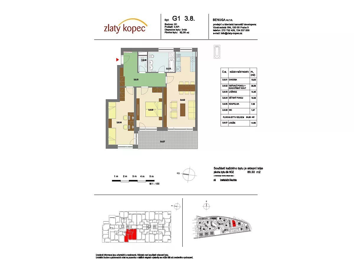 Nabízíme k prodeji prostorný byt 3+kk připravený k nastěhování v právě zkolaudovaném projektu Zlatý kopec v obci Přezletice, Praha-východ. V ceně je zahrnuto parkovací stání a sklep. Byt má velký obývací pokoj s kuchyňským koutem a vstupem na prostornou lodžii se západní orientací, dvě samostatné ložnice (ideální jako dětský pokoj a rodičovská ložnice nebo pracovna), koupelnu s toaletou, dvěma umyvadly, vanou a místem pro pračku a další samostatné WC. Dispozice bytu nabízí komfortní bydlení pro 3-4člennou rodinu nebo pár, který uvítá pracovnu. Obec Přezletice leží u pražské Vinoře, na hranici Prahy 9. Přímo v bytovém projektu najdete ordinaci lékaře, komunitní centrum, kosmetický salón, dermatologii, velké sportoviště a dětská hřiště. V obci je mateřská i základní škola, další obchody a služby jsou v nedaleké Vinoři. Spojení MHD na metro Letňany trvá přibližně 15 minut, autem do centra Prahy cca 30 minut. Budovy G1 a G2 jsou poslední etapou bytového projektu Zlatý kopec. Klidná lokalita, příroda, dobrá dostupnost do centra Prahy. Rádi vám byt ukážeme - napište nebo zavolejte pro domluvu prohlídky. Fotografie vybavení slouží pouze jako ilustrační příklad. Rozměry a rozmístění nábytku jsou orientační. Zobrazené vybavení není součástí prodeje.
