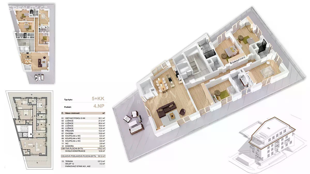 Představuji rezidenci, která přináší výjimečnost do každodenního života - výjimečný byt 5+kk situovaný v prestižní části Příbrami, na Zdaboři. Nabídka, která osloví náročné klienty hledající nadstandardní prostor, soukromí i reprezentativní zázemí. Tento mimořádně velkorysý byt o celkové ploše 191 m², s terasou o ploše 127,3 m2 a sklepem o ploše 4,3 m2 se nachází ve čtvrtém nadzemním podlaží moderní rezidence. Kombinuje harmonii sofistikovaného designu s nekompromisním důrazem na komfort. Plynulé dispoziční řešení vytváří otevřený, světlý a elegantní domov, ideální jak pro rodinné zázemí, tak pro reprezentativní způsob života. Absolutním unikátem je terasa o úctyhodné výměře 127,3 m² - skutečný privátní exteriérový prostor, který umožňuje vytvořit zahradu ve výškách, relaxační zónu, místo pro společenské večery i klidnou oázu po náročném dni. Terasa přímo navazuje na obytnou část a nabízí výhledy, které podtrhují exkluzivitu celé nabídky. Součástí je také sklepní koje o 4,3 m², ideální pro uskladnění sportovního vybavení či sezónních věcí. Lokalita Zdaboř patří k nejvyhledávanějším adresám Příbrami - nabízí klid, soukromí a kultivované prostředí, přitom stále v pohodlné dostupnosti centra města i veškerých služeb. Je to místo, kde se kvalita bydlení promítá do každé vteřiny. Tento byt představuje více než jen nemovitost. Je to prostor, který má ambici stát se domovem na výjimečné úrovni. Pokud hledáte kombinaci nadčasového luxusu, špičkového zázemí a prestižní adresy, právě jste ji našli. Tento výkres byl vypracován pro marketingové účely. Podlahová plocha bytu je vypočtena dle Vyhl. 366/2013Sb. Plochy místností jsou pouze orientační. Vyobrazené vybavení bytu (nábytek, kuchyňská linka, elektrospotřebiče atd.) není součástí dodávky a je pouze ilustrativní. Rozsah dodávky je specifikován ve standardu a smlouvě s klientem. Investor si vyhrazuje právo na změnu.