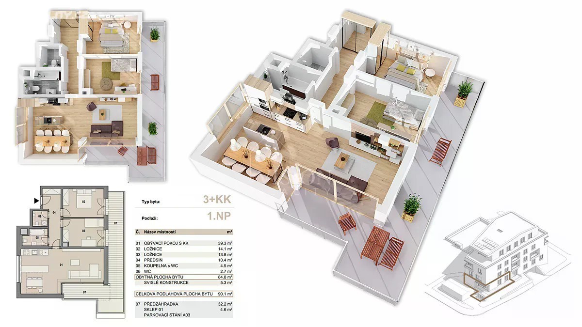 Nabídka, která v sobě spojuje pohodlí domova, nadstandardní provedení a jedinečný prostor pro rodinný život. V Příbrami, části Zdaboř, v prvním nadzemním podlaží moderní novostavby, se nachází výjimečný byt 3+kk o velkorysé ploše 90,1 m², který splní představy i těch nejnáročnějších. Od prvního okamžiku působí elegantně, promyšleně a s citem vytvořený interiér přináší atmosféru skutečného domova. Skutečným klenotem této nabídky je luxusní předzahrádka o rozloze 32,2 m², která je přístupná z každé ložnice i z obývacího pokoje. Vytváří tak plynulé propojení vnitřního a venkovního prostoru, ideální pro rodiny s dětmi - bezpečné místo pro hraní, ranní kávu i večerní odpočinek po celém dni. Zelený exteriér přirozeně rozšiřuje obytný prostor a poskytuje soukromí, které je dnes tak vzácné. Byt je vybaven ve vysokém standardu, s důrazem na kvalitní materiály, funkční řešení a estetiku. Samozřejmostí je prostorná koupelna s WC a také samostatná toaleta, což významně zvyšuje komfort každodenního života. K bytu náleží také sklep o výměře 4,6 m², ideální pro uložení sportovních potřeb, kočárků či sezónních věcí. Tento byt nabízí nejen moderní styl a vysoký komfort, ale především prostředí, kde může rodina růst, relaxovat a skutečně žít. Prostor, který hýčká, inspiruje a poskytuje jistotu domova. Tento výkres byl vypracován pro marketingové účely. Podlahová plocha bytu je vypočtena dle Vyhl. 366/2013Sb. Plochy místností jsou pouze orientační. Vyobrazené vybavení bytu (nábytek, kuchyňská linka, elektrospotřebiče atd.) není součástí dodávky a je pouze ilustrativní. Rozsah dodávky je specifikován ve standardu a smlouvě s klientem. Investor si vyhrazuje právo na změnu.
