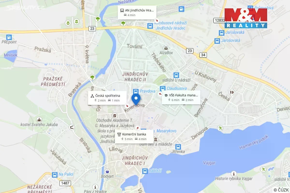 Nabízíme k pronájmu kancelářské prostory se samostatným vstupem z ulice o velikosti 52 m² situované v centru Jindřichova Hradce. Nemovitost se nachází v 1. nadzemním podlaží budovy, která zajišťuje unikátní pracovní prostředí. Jedná se o 2 průchozí místnosti s tím, že každá má i vlastní vstup ze společných prostor domu. Kancelář je ideální pro jednotlivce nebo menší firmu hledající reprezentativní kancelář v srdci města. Stav nemovitosti je velmi dobrý, což umožňuje okamžité nastěhování bez nutnosti dalších úprav. Výhodou je blízkost veškeré občanské vybavenosti a snadná dostupnost. Energie jsou měřeny podružně a každý měsíc je majitel vyúčtovává. Pro nájemce je připravena společná kuchyňka a sociální zázemí. Vstup do domu je zabezpečen kamerovým systémem. Majitel požaduje kauci ve výši 1x měsíční nájem. Provize za zprostředkování ve výši 1x měsíční nájem.