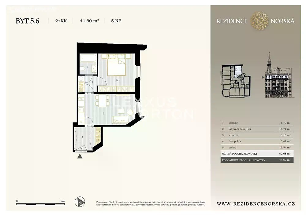 Představujeme světlý byt 2+kk o podlahové ploše 44,60 m², umístěný v 5. nadzemním podlaží kompletně zrekonstruované secesní rezidence. Dispozice nabízí praktické zádveří, na které navazuje chodba s přístupem do koupelny s vanou a do dvou samostatně oddělených místností - obývacího pokoje s kuchyňským koutem a ložnice. Obývací pokoj poskytuje příjemně členěný prostor pro denní zónu i kuchyň a díky orientaci do ulice je dostatečně světlý po celý den. Ložnice navazuje na klidnější část dispozice a nabízí pohodlný prostor pro každodenní odpočinek. Rohový secesní dům prošel kompletní a citlivou rekonstrukcí se zachováním původních architektonických detailů ve společných prostorách. Nový výtah zajišťuje pohodlný přístup do všech pater. Projekt je dokončen a byt je ihned k nastěhování. Dubové parketové podlahy, dřevěná špaletová okna, koupelna osazena kvalitní sanitou, plynová kotelna v 1. podzemním podlaží Rezidence Norská se nachází v nárožním domě na křižovatce ulic Kodaňská a Norská, přímo naproti parku Heroldovy sady. Lokalita nabízí ideální kombinaci historického kouzla a moderního městského života - v okolí najdete stylové kavárny, restaurace, kulturní podniky i kompletní občanskou vybavenost širšího centra Prahy. Díky skvělé dopravní dostupnosti se do centra města dostanete během několika minut.