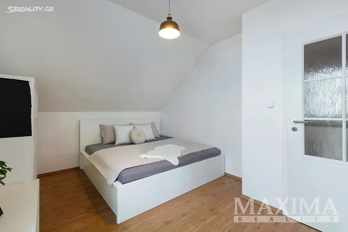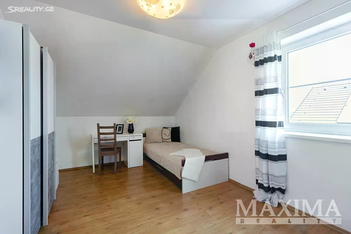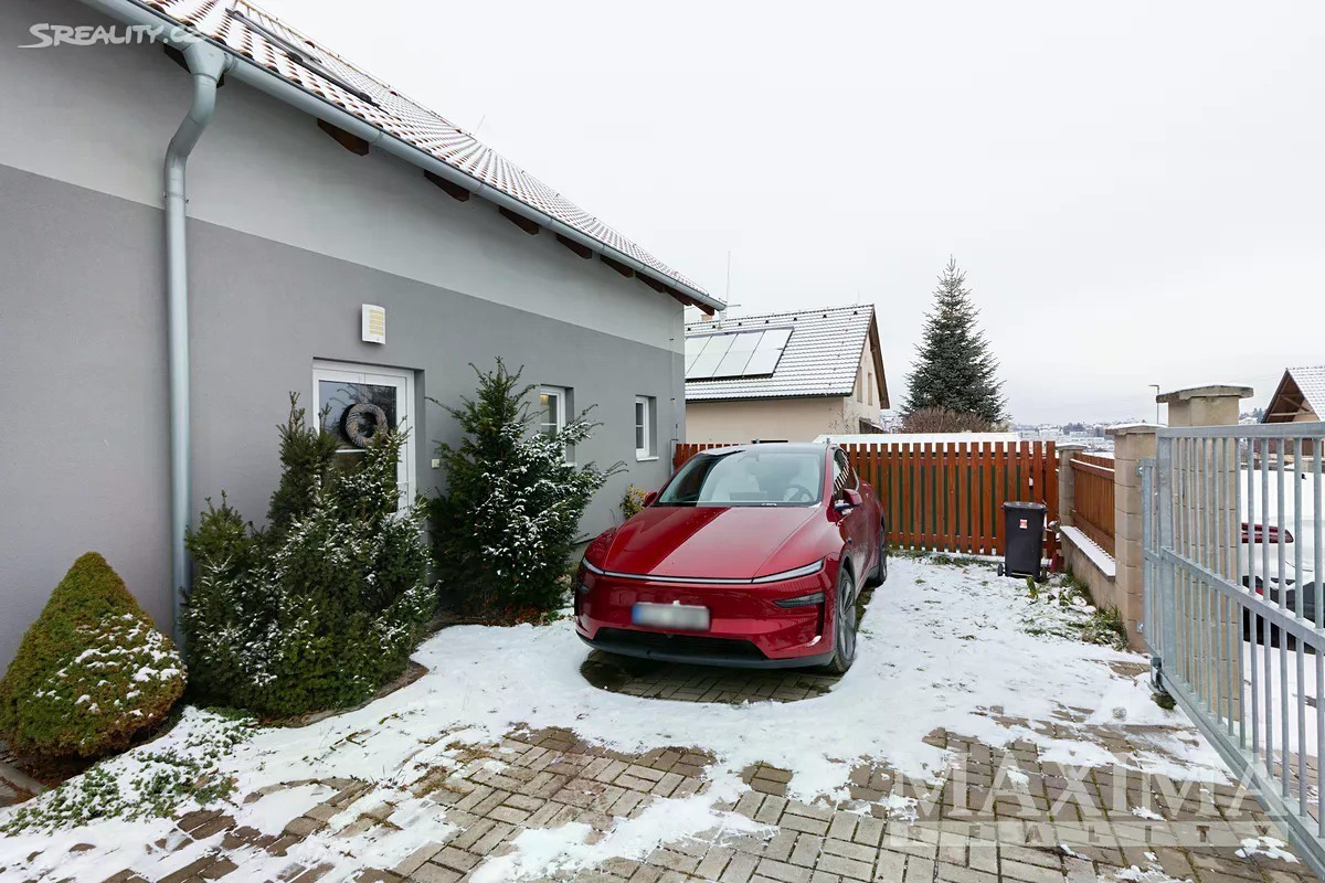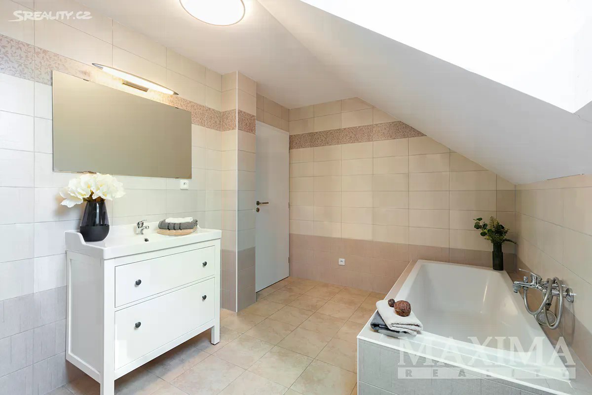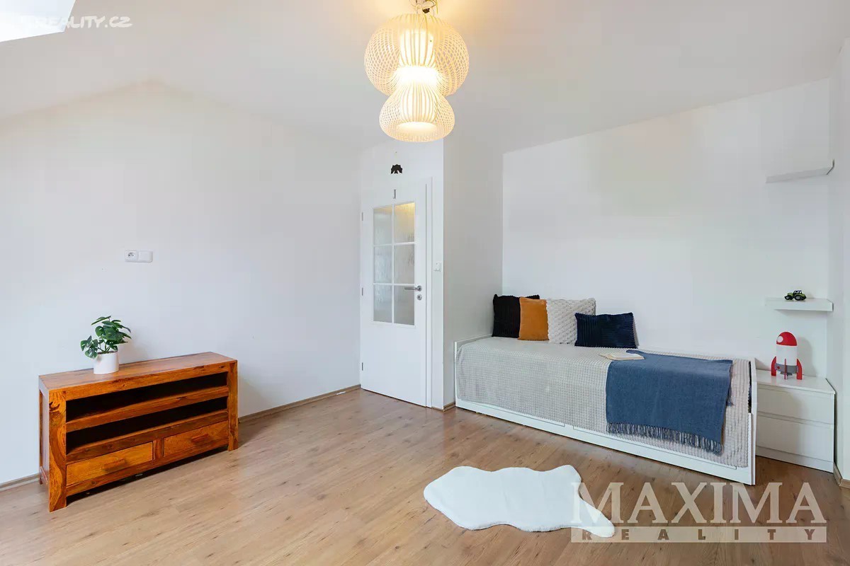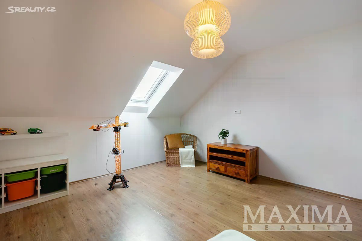 Nabízíme k prodeji prostorný a světlý byt 4+1, který se nachází v samostatné polovině novostavby domu z roku 2016. K bytu náleží vlastní zahrada o ploše 349 m2. Nemovitost je situována v klidné lokalitě s množstvím zeleně a několika rybníky v okolí. Dispozice bytu 4+1 o celkové ploše 129 m2 tvoří v přízemí obývací pokoj (31,56 m2) s kuchyní (5,83 m2) a kuchyňskou linkou, s přímým vstupem na terasu s možností posezení a výhledem do zahrady. Dále zde najdete pracovnu (5,42 m2), WC s technickou místností (3,16 m2), komoru pod schodištěm (5,78 m2) a prostorné zádveří (6,68 m2). Po schodišti se dostanete do podkroví, kde se nachází ložnice (16,89 m2), dva samostatné pokoje (13,78 m2 a 13,99 m2), praktická koupelna (10,23 m2) s vanou, sprchovým koutem, toaletou i bidetem, chodba (4,58 m2). Pro uskladnění věcí poslouží prostorná půda. Okna jsou plastová s izolačním trojsklem, v obývacím pokoji orientovaná na západ. Topení je v obou patrech podlahové - zajišťuje elektrický kotel,ohřev vody bojler. V obývacím pokoji komín - možnost instalace krbových kamen. Na udržované zahradě se nachází skleník s napojením na vodu včetně osvětlení a kůlna na nářadí, rovněž s osvětlením. Dům je napojen na obecní vodovod i kanalizaci. Parkování je možné přímo před domem pro jedno auto, další možnosti jsou na ulici. Součástí je také příprava na wallbox pro nabíjení elektromobilu. Obec disponuje dobrou občanskou vybaveností - restaurace, hospoda, školy, školky, lékařské služby, lékárna, pošta, obchody, supermarkety, restaurace či dětská hřiště. Jedná se o bezpečnou a klidnou rezidenční lokalitu. Autobusové zastávky nabízí pravidelné spoje do Prahy (Zličín, Veleslavín). Výborné je také dopravní napojení na dálnice D6 a D7, na Zličín dojedete autem za cca 15 minut. Nemovitost je možné financovat hypotečním úvěrem, s jehož vyřízením vám rádi pomůžeme. PENB: B
