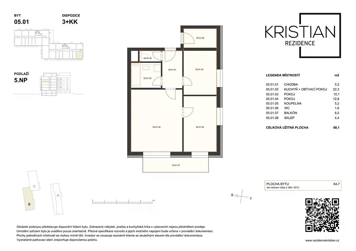 V novém developerském projektu Rezidence Kristian nabízíme prodej, moderního a nízkoenergetického bydlení v bytu 3+kk s balkónem a vnitřním parkovacím stáním ve vyhledávané lokalitě v Hradci Králové - Moravské Předměstí. Bytová jednotka se nachází v 5. NP zděného bytového domu, celková užitná plocha 68,1 m2, 1x balkón (6,5 m2), sklep 4,4 m2. Dispozice: vstupní chodba, obývací pokoj s kuchyňským koutem, jídelnou, ložnicí, pokojem, koupelna, WC. Vytápění: ústřední dálkové. K bytu náleží 1x vnitřní parkovací stání. Ve standardním provedení: plastová okna hranatá s izolačním trojsklem, vinylové podlahy KPP - výběr z 12 typů dekorů, koupelna s keramickou dlažbou La Ceramica Factory - výběr ze 4 dekorů, obklady Rako Systém, umyvadlo keramické se stojánkovou pákovou baterií, vana bílá akrylátová obdélníková. WC závěsné bílé. Použité materiály kombinují moderní technologie a udržitelnost a především snižují energetické náklady. Bytová jednotka se nachází na Moravském Předměstí v novostavbě bytového domu v Rezidenci Kristian. Výhodou lokality je veškerá občanská vybavenost v místě a výborná dopravní dostupnost. Pěkné, klidné bydlení pro rodinu s dětmi. Parkování je zajištěno v podzemních garážích a venkovních parkovištích přímo v rezidenci. Bližší informace Vám rádi sdělíme v realitní kanceláři. Máme pro Vás připraveny informace k hypotečnímu úvěru, který vyřídíme podle Vašich požadavků.