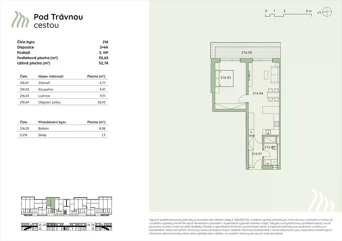 Útulný byt 2+kk s balkonem a moderním standardem Byt 2+kk o podlahové ploše 55,63 m² se nachází ve 2. nadzemním podlaží nového bytového domu v Nymburce a je ideální volbou pro jednotlivce nebo mladý pár hledající kompaktní, ale kvalitní a pohodlné bydlení. Dispozice zahrnuje světlý obývací pokoj s kuchyňským koutem, ložnici, koupelnu, samostatné WC a technickou místnost. K bytu náleží velká terasa o výměře 8,98 m² a sklep, které rozšiřují užitnou hodnotu celého bytu. Součástí vybavení je komfortní teplovodní podlahové vytápění napojené na centrální plynovou kotelnu, dřevohliníková okna, kvalitní vinylové podlahy a výsuvné markýzy s integrovaným osvětlením a větrným čidlem. Nechybí ani příprava na instalaci předokenních žaluzií a klimatizace. Samozřejmostí je i sklep a parkovací stání, které se dokupuje k bytu zvlášť. Celkový standard odpovídá vysokým nárokům na kvalitu provedení, energetickou úspornost a moderní design. Projekt Pod Trávnou cestou volně navazuje na úspěšně realizovanou 1. etapu a projekt Rezidence Babín, kde vzniká kvalitní a klidné bydlení. Zaujalo vás to? Napište mi a rád vám sdělím veškeré detaily k projektu i aktuální nabídce.