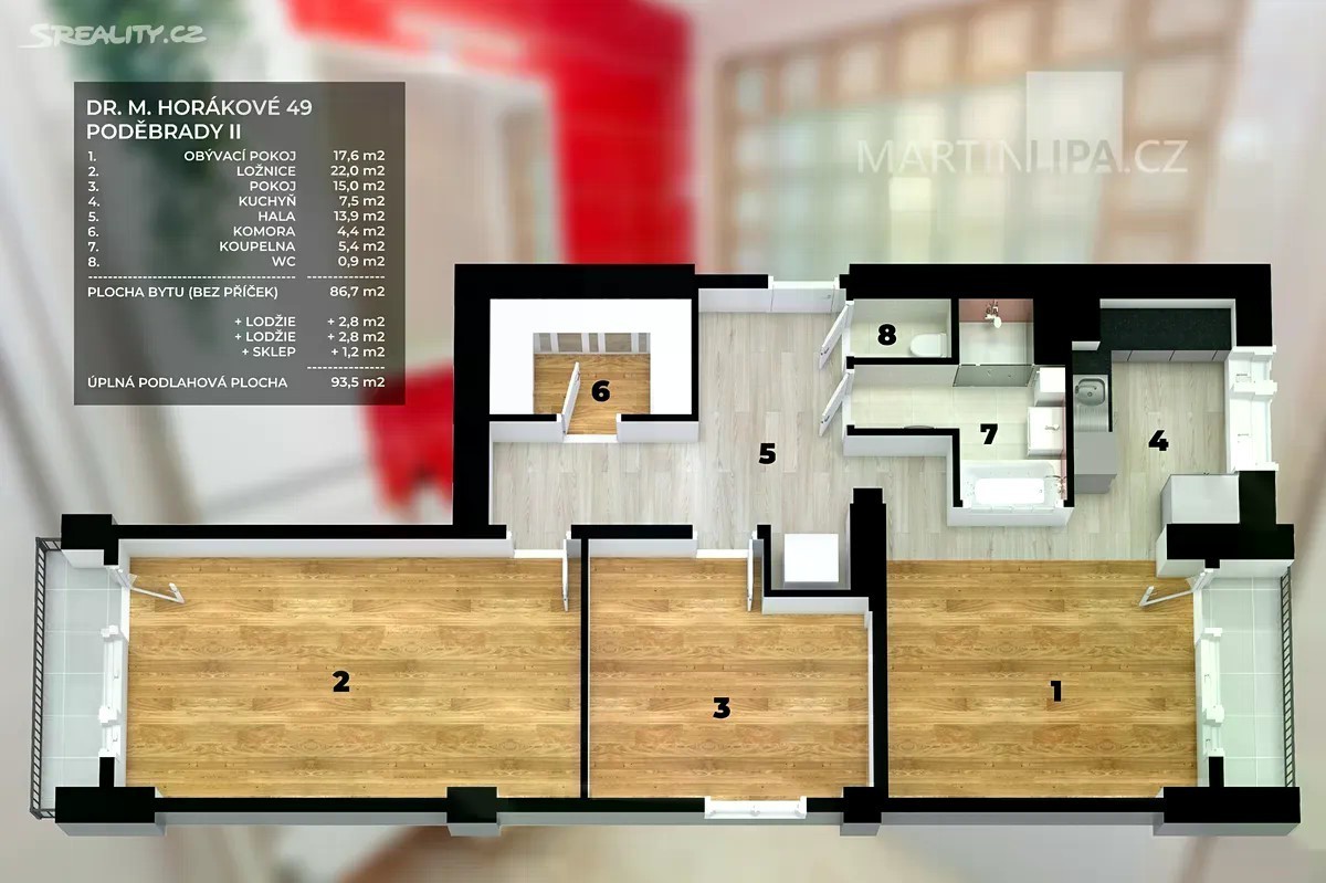 S tímhle bytem vám nebude ani trošku vadit, že za okny sněží. Strávit v něm celý den není za trest, ale za odměnu. Jsme v Poděbradech, v bytě 3+1 o užitné ploše přes 86 metrů, s příslušenstvím dokonce 94. Po kompletní moderní rekonstrukci, v jedenáctém - předposledním - patře zatepleného panelového domu. V praxi to znamená: spousta světla, výhledy, ticho - a žádné starosti. Hned za vstupem vás přivítá velkorysá hala. Ne stísněný tunel, ale prostor, kde se dá žít - převléct děti, složit tašky, postavit botník i lavici. Praktická nika na pračku a sušičku drží technické věci mimo obytnou část. A teď do ložnice, kde rána začínají a večery končí. Na více než 22 metrech se sem vejde velká postel, skříň i pracovní stůl a pořád tu zůstane místo, aby místnost dýchala. Velká okna, vstup na lodžii. Místo, kde si člověk neukopne palec o postel a klidně si zacvičí jógu. Přesuňme se rovnou do kuchyně. Ne malá, ne obří - tak akorát. Čisté linie, úložné prostory, vestavné spotřebiče AEG, indukce, mikrovlnka, trouba, a k tomu americká lednice s výrobníkem ledu. Velké okno poskytne světlo pro všechna vaše kulinářská kouzla - a když kouzlo selže, snadno vyvětráte. Obývací pokoj - velký světlý prostor, kam se vejde sedačka, konferenční stolek, televize i pracovní nebo herní koutek. Podlaha s ořechovým dekorem a stěna z luxfer dodávají místnosti útulnost a moderní čistotu. Místnost, která neurazí žádný vkus a snadno se doladí do vašeho stylu. Součástí obýváku je jídelní kout u oken - světlo, prostor na velký stůl a místo, kde se sedí dobře ráno i večer. A hned vedle vstup na druhou lodžii. Další pokoj může být čímkoliv - dětský, studentský, pracovna nebo místnost pro virtuální realitu. Tak akorát velký, uprostřed bytu. Z haly se dostanete do místnosti, která spoustě lidí splní velký sen - šatnu. Skutečnou walk-in šatnu se systémem polic, zásuvek a věšáků, kam schováte sezónní oblečení, kufry i sportovní vybavení, a byt přesto působí uklizeně. Domácí wellness, nebo, chcete-li, koupelna. Dominantní červenobílé obklady, skleněná stěna z luxfer, skříňka s umyvadlem a hlavně masážní vana s podsvícenou vodou. Stačí napustit, zapálit svíčku a máte večerní spa. Pokud není čas na dlouhý relax, je tu velký sprchový kout a žebříkový radiátor. Samostatné WC je samozřejmostí. Byt má dvě lodžie - západní z obýváku, východní z ložnice. Ranní káva nad Poděbrady, večerní sklenka při západu slunce. Z 11. patra je vidět pěkně daleko. Dům je zateplený, má dva výtahy, dva vchody, zadní bez bariér díky rampě. Udržovaný vstup, kolem domu zeleň, parkování v okolí relativně snadné. Sportoviště, školy, nákupy, náměstí i vlak máte na dohled. A když chcete vyměnit panel za kolonádu, lázeňský park a řeku, jste tam za pár minut. Večer se vrátíte nahoru, zavřete byt - a klid nad městem je zase váš. Jestli hledáte hotový, funkční rodinný byt 3+1 bez dalších investic, kde všechno dává smysl a dobře se žije, může to být váš nový domov. Vůbec na nic nečekejte, vemte telefon a zavolejte.