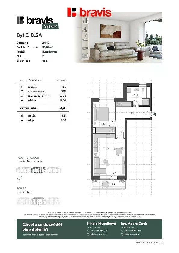 PRODEJ NOVÝCH BYTŮ VE VYŠKOVĚ ZAHÁJEN! Hledáte nové, komfortní bydlení v žádané lokalitě s vynikající dostupností služeb i centra města? Potom Vás jistě zaujme moderní byt 2+kk o užitné ploše 53 m² v unikátním developerském projektu Rezidence Haná ve Vyškově - Předměstí. Tento byt označený jako B.5A, nacházející se ve 5. nadzemním podlaží, je ideální nejen k vlastnímu bydlení, ale i jako bezpečná investiční příležitost. Předsíň (11,69 m²) - velkorysý prostor připravený na vestavěné skříně a praktické úložné řešení Koupelna + WC (5,97 m²) - moderní, prostorná, s přípravou pro designový interiér dle Vašeho výběru Obývací pokoj s kuchyňským koutem (23,33 m²) - prosvětlený, s přímým vstupem na velký balkon Ložnice (12,02 m²) - klidná, útulná zóna pro Váš ničím nerušený odpočinek Balkon (6,51 m²) - místo na relax, posezení i bylinky Sklepní kóje (4,84 m²) - bezpečné místo pro sportovní vybavení, kolo či sezonní věci Proč je tento byt skvělou volbou? Novostavba s vysokým standardem provedení v energeticky mimořádně úsporné budově (třída PENB A). Vlastní balkon pro ranní kávu na čerstvém vzduchu i večerní relax s výhledem. Sklep a možnost parkování přímo u domu (velkokapacitní veřejné parkoviště). Klidná, oblíbená lokalita v pěším dosahu centra města, napojení na MHD, rychlý dojezd na D1, v blízkosti Brna. Perfektní občanská vybavenost: vše po ruce (školy, školky, obchody, restaurace, lékaři, kino.) Moderní architektura s důrazem na světlo, prostor a funkčnost. Vyšší standard, nízké provozní náklady a možnost úprav dle Vašich představ Odolné a kvalitní stavební materiály. Stylové koncové elektroprvky a kvalitní topná tělesa s regulací. Designové zařizovací předměty, široký výběr obkladů a dlažeb. Příprava pro předokenní žaluzie, optický internet. Komfortní rigidní vinylová podlaha - odolná, příjemná na chůzi. Energetická úspornost - bytový dům v nejvyšší třídě A. Možnost klientských změn dle Vašich osobních preferencí. Komfortní, moderní a bezpečné bydlení v krásné nové čtvrti - v naprostém klidu, ale s velmi snadnou dostupností občanské vybavenosti, služeb či pracovních příležitostí. Bydlete moderně, s úsporou i stylem - v Rezidenci Haná u řeky Haná! Nezmeškejte možnost stát se jedním z prvních majitelů tohoto výjimečného bytu. Realizujte svůj sen o novém domově a kontaktujte nás ještě dnes pro více informací nebo sjednání osobní schůzky.