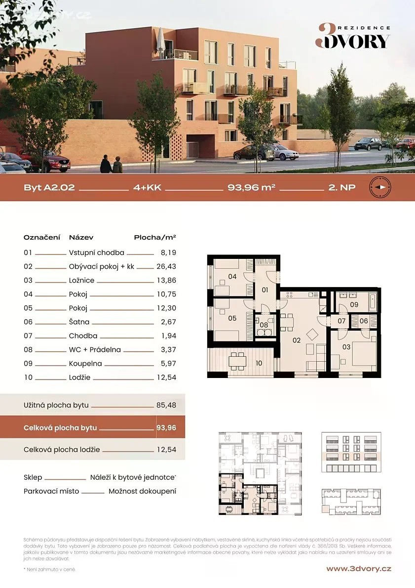 Hledáte prostorný byt pro rodinu v klidné lokalitě s výborným spojením do Brna? Nabízíme k prodeji byt typu 4+kk o výměře 106,50 m2, která zahrnuje podlahovou plochu bytu 93,96 m2 a lodžii o velikosti 12,54 m2. Byty se nacházejí v rezidenčním komplexu Tři Dvory, na okraji malebného města Újezd u Brna, vzdáleného pouze 15 km od centra Brna. Rezidence Tři Dvory přináší nový pohled na moderní bydlení - spojuje klid přírody s pohodlím městského života. V nabídce jsou útulné byty od 1+kk až po prostorné 4+kk, každý s balkonem, terasou nebo předzahrádkou, které rozšiřují obytný prostor a přibližují vás k přírodě. U vybraných bytů je ve standardu příprava na klimatizaci, fotovoltaické panely a předokenní žaluzie. Zákazníci si mohou bydlení dovybavit podle svých představ - třeba o podlahové vytápění pro ještě větší pohodlí. Dokončení projektu je plánováno na 3. čtvrtletí roku 2027. Pro více informací o aktuální nabídce navštivte náš web nebo kontaktujte naše specialisty.