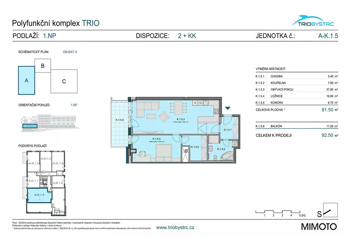 Nadstandardní bydlení, které vás okouzlí! Nabízíme nadstandardní 2+kk s balkónem o celkové ploše 92,5 m². Koupelna je vybavena jak rohovou vanou, tak i sprchovým koutem. Součástí jednotky je i praktická šatna nebo komora. Jednotky, které splní Vaše vysoké nároky se pyšní: - vysokým standardem vybavení koupelny a toalety s velkoformátovým obkladem - podlahové vytápění - rekuperace vzduchu (výměna vydýchaného vzduchu za přiváděný čerstvý vzduch z venku při zajištění energeticky efektivního zadržení tepla uvnitř bytu) - velkoformátová okna s izolačním trojsklem - chlazení v horkých letních dnech pro vybrané jednotky - příprava pro předokenní žaluzie Projekt TRIO - přináší moderní a úsporné technologie: - energetická kategorie třídy A - fotovoltaické panely - tepelná čerpadla - zelená střecha - úsporné LED osvětlení - dostatek parkovaní a sklepních kójí Život plný možností v nádherném prostředí, kde máte vše na dosah: 5 - 10 minut pěšky: - zastávka autobusů, trolejbusu a tramvají - ZŠ a MŠ Heyrovského a Laštůvkova - OC JAVOR s poliklinikou (restaurace, drogerie, supermarket, pekárna a další) - supermarket Albert, LIDL a oděvy KIK - Společenské centrum, knihovna a sportovní hala - dětská hřiště, sportoviště Údolí oddechu, obora Holedná - Úřad MČ Brno Bystrc, kostel 5 minut autem: - Brněnská přehrada, ZOO Brno - Wellness Resort Maximus - UNI HOBBY market a Čtyřlístek zahradnické centrum - ZŠ Vejrostova, Gymnázium Vejrostova a další 4 MŠ - SPORTMAX sportovní centrum a FC DOSTA - OC MAX s poliklinikou (restaurace, supermarket Billa, Česká pošta a další obchody a služby) - 2 veterinární kliniky - restaurace, supermarkety, kavárny a další dětská hřiště Kontaktujte nás ještě dnes! Navštivte naše webové stránky a najděte si svůj vysněný byt! Těšíme se na osobní setkání, kde probereme vaše představy a přání. Prodej je přímo od developera, takže neplatíte žádné provize ani poplatky navíc! Dokončení projektu je naplánováno na Q1/2027.