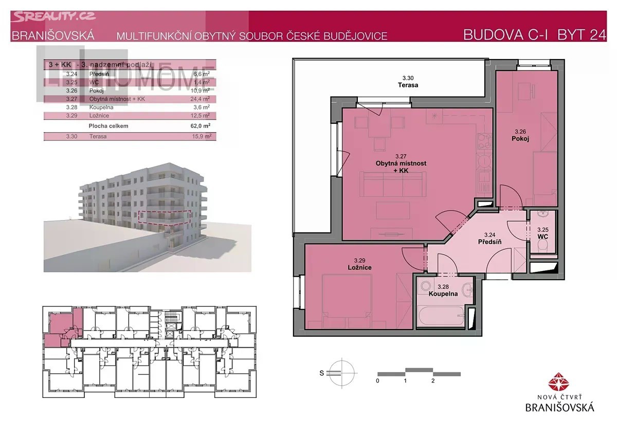 ihned k nastěhování • prodej přímo od developera Vaše nové bydlení je připravené - poslední volné jednotky! K dispozici je moderní byt 3+kk o velikosti 62 m² s terasou 15,90 m² v projektu Nová čtvrť Branišovská, České Budějovice. Byt se nachází ve 3. patře novostavby. Díky promyšlené dispozici nabízí pohodlné bydlení pro jednotlivce, páry i rodiny. Standard a vybavení: - kvalitní keramická dlažba - trvanlivé vinylové podlahy - elegantní interiérové dveře s obložkami - Interiér spojuje moderní design, praktičnost a dlouhou životnost. Lokalita - Nová čtvrť Branišovská: - klidné prostředí u zeleně - rychlá dostupnost do centra Českých Budějovic - skvělá poloha poblíž Jihočeské univerzity - atraktivní i jako investice - kompletní občanská vybavenost v docházkové vzdálenosti - ideální místo pro aktivní život (procházky, cyklostezky, příroda) Bytový dům C - moderní rezidenční projekt: - Součástí projektu je 136 bezbariérových bytů s dispozicemi 2+kk a 3+kk. - Každý byt disponuje balkonem, lodžií nebo terasou. - Možnost dokoupení garážového stání i sklepní kóje. K nastěhování: ihned Kontaktujte nás pro informace o financování a aktuálně volných jednotkách.