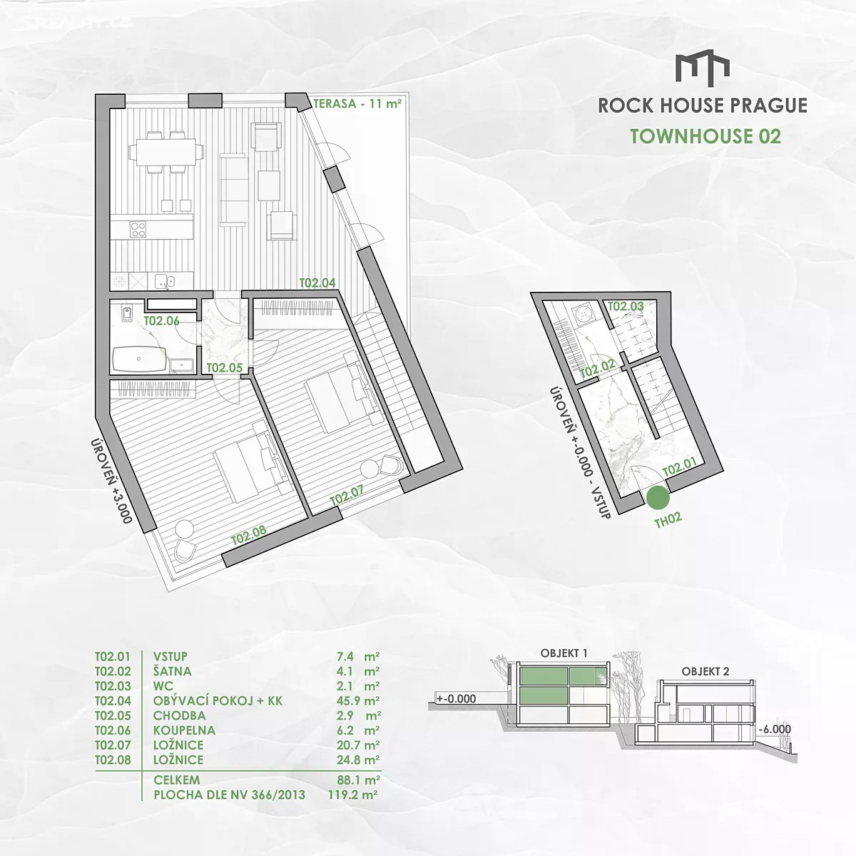 K prodeji nabízím mezonetovou bytovou jednotku typu townhouse se samostatným vstupem, umístěnou v nově vznikajících viladomech projektu Rock House Prague. Byt o dispozici 3+kk má podlahovou plochu 119,20 m². K jednotce dále náleží terasa o výměře 11 m². Projekt je situován v jedinečné lokalitě Prahy 5 - Hlubočepy, v bezprostřední blízkosti přírodní rezervace Prokopské údolí. Díky poloze na mírně svažitém terénu je harmonicky zasazen do okolní zeleně a obklopen nízkopodlažní rezidenční zástavbou, která zajištuje klidné a příjemné prostředí. Komplex tvoří dva třípodlažní viladomy se šesti atypickými jednotkami, navrženými renomovaným architektonickým studiem. Originální architektonické prvky dodávají projektu moderní a nadčasový charakter. Součástí areálu jsou zatravněné plochy a zeleň určená k odpočinku. Bytové jednotky se prodávají v provedení White Walls - dokončená hrubá stavba s omítkami, podlahovým vytápěním a připravenými rozvody. Klient má možnost dokončení interiéru podle vlastních představ. Technologie a vybavení - vytápění a ohřev vody zajištěny tepelnými čerpadly vzduch-voda ve společné kotelně - v bytech teplovodní podlahové topení + elektrické žebříky v koupelnách - každá jednotka má vlastní měření a regulaci Projekt je koncipován jako nízkoenergetický. Termíny - hrubá stavba dokončena - kolaudace plánována na 1. čtvrtletí 2026 Lokalita - přímý kontakt s přírodou: Prokopské údolí, Červený lom, Chuchelský háj - ideální pro procházky, cykloturistiku i relaxaci - výborná dopravní dostupnost - zastávka MHD přímo u domu; autem rychlé spojení přes Barrandovskou radiálu na Městský okruh - kompletní občanská vybavenost v okolí K bytovým jednotkám je možné dokoupit parkovací stání. Při uzavření kupní smlouvy do konce roku získáte od developera bonus - návrh interiéru. Rock House Prague propojuje komfort městského života s klidem přírody. Objevte jedinečnou lokalitu - ráda Vám projekt osobně představím. Technické provedení - standardy Konstrukce - Základová konstrukce: budova je založena na železobetonové zateplené desce. - Svislé konstrukce: obvodové a vnitřní stěny jsou ze směsi železobetonu a cihelných bloků. - Zateplení a fasáda: obvodové stěny jsou zateplené a opatřené dekorativní fasádní omítkou. Okna - Instalována okna s hliníkovými rámy a trojitým izolačním zasklením (trojsklem) s nadstandardními tepelně-izolačními vlastnostmi. Vytápění a ohřev vody - Ve všech bytech je instalováno teplovodní podlahové vytápění. - Zdrojem tepla a teplé vody jsou tepelná čerpadla. Elektroinstalace - Kompletní elektroinstalace s přípravou pro všechny běžné domácí spotřebiče a technologie. - Připravené rozvody pro osvětlení, kuchyň, koupelnu a datové sítě. Vnitřní úpravy - Vnitřní stěny jsou omítnuty. - Podlahová skladba je připravena pro finální povrchy, proveden suchý betonový potěr. Instalace Kompletní skryté instalace - voda, kanalizace, topení i elektro - jsou integrovány do konstrukcí bytů.