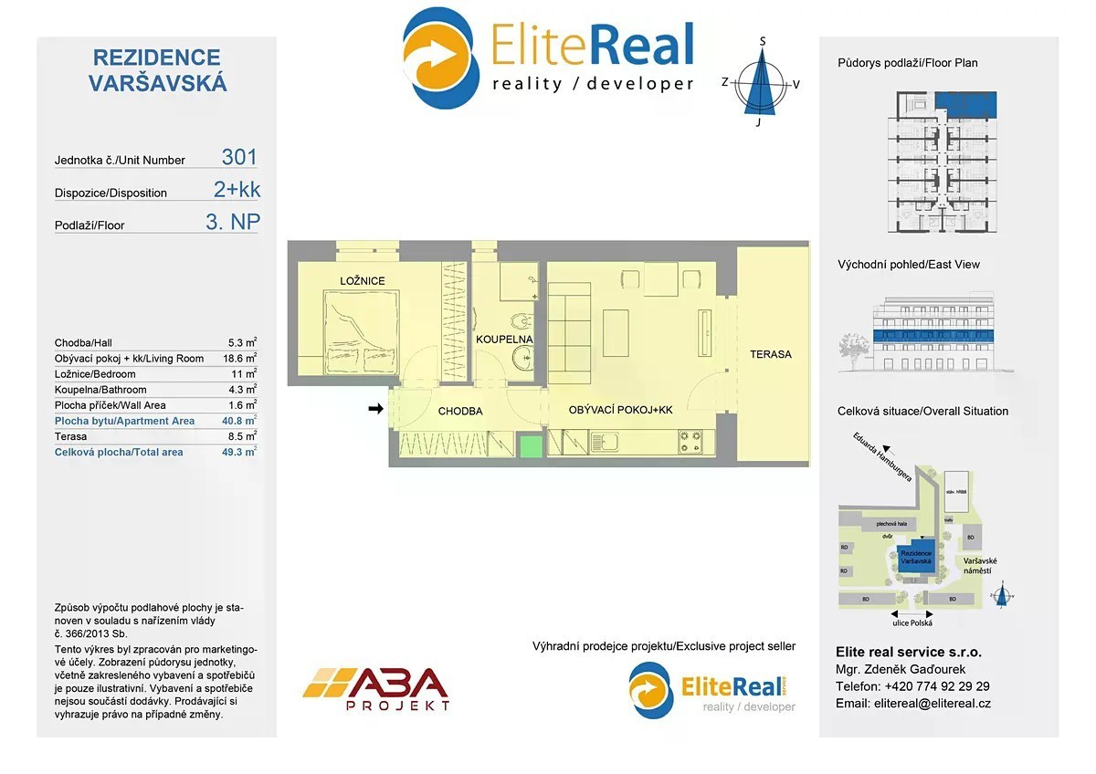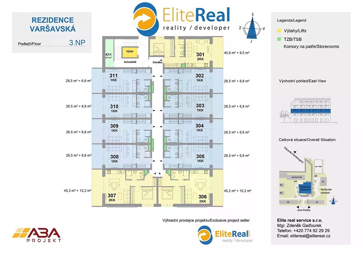 Elite real service s.r.o., výhradní prodejce projektu, Vám nabízí prodej nové bytové jednotky v městské části Olomouc - město v blízkosti ul. Wolkerova, výstaviště Flora, Čechových a Smetanových sadů v developerském projektu Rezidence Varšavská. Předpokládaný termín dokončení 12/2026. Bytová výstavba je vzdálena pouze cca 5 minut od historického centra města a je situována ve vyhledávané lokalitě s výbornou občanskou vybaveností a dopravním napojením. Nabídka projektu zahrnuje investiční byty 1+kk a 2+kk ve vysokém standardu. Byty ve vyšším podlaží nabízí výhled na široké okolí. Bytová jednotka 2+kk 301 je situována v 3.NP, je orientována na severovýchod. Plocha jednotky 40,8 m2 + plocha terasy 8,5 m2, k bytu náleží komora. Zajistíme Vám bezplatně financování nemovitosti. Nabízíme klientům služby vlastního hypotéčního centra s výhodami, které jsme pro Vás s bankovními ústavy připravily. Kupte si nové nízkonákladové bydlení - bytový dům je zařazen do energetické třídy B. Půdorys bytové jednotky, který zde prezentujeme, je základní. Dispozici nové jednotky a design si můžete upravit dle vlastních požadavků. Jednotky je možno slučovat i rozdělovat dle fáze výstavby. Nechte si postavit nový byt dle vašich představ. Standardní vybavení bytů splňuje požadavky vysokého standardu a moderního bydlení (vinylová podlaha, obložkové zárubně, moderní keramické obklady, francouzské okno, atd.). Výjimečná investiční příležitost koupě nového bytu na dobré adrese. V blízkosti nově vznikajícího bytového projektu se nachází tramvajová a autobusová zastávka, vlaková stanice Olomouc - město, výstaviště Flora, hotel Comfort, Čechovy a Smetanovy sady, supermarkety, zdravotnické zařízení (Fakultní nemocnice Olomouc) a další. Pro investory zajištujeme bezplatně následný pronájem, případně i správu nemovitosti. Doporučujeme osobní jednání a prohlídku výstavby - volejte makléře. Bližší informace k bytovému projektu a největší nabídku novostaveb - nových bytů, bytů na prodej, bytů k pronájmu - naleznete na našich webových stránkách.