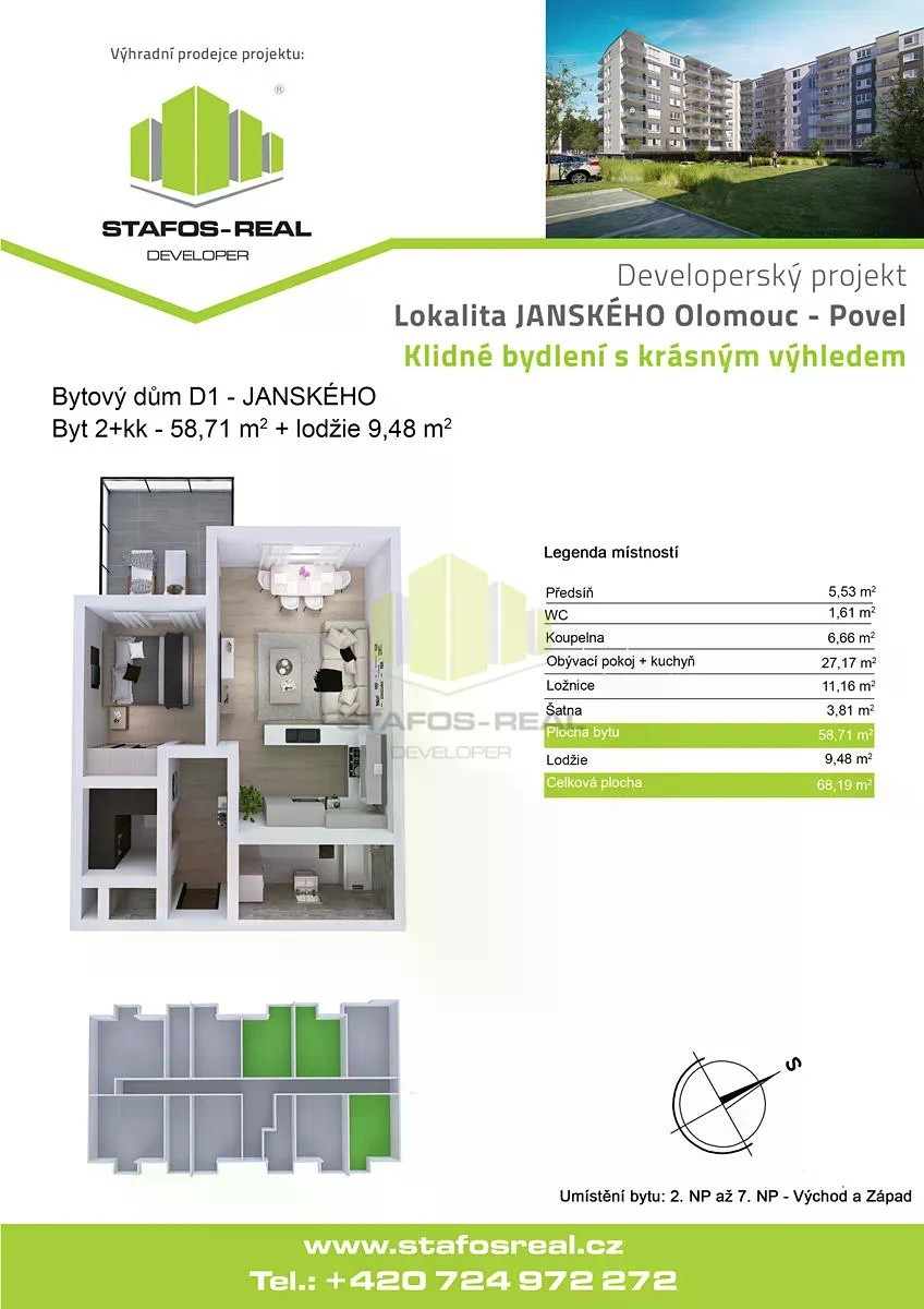 Představujeme vám jedinečnou příležitost k pronájmu novostavby luxusního bytu 2+kk s užitnou plochou 58,71 m2 a lodžií o rozloze 9,48 m2. Tento exkluzivní byt se nachází ve 4. nadzemním podlaží kvalitní novostavby, zkolaudované ke konci roku 2023. Těšit se můžete na prestižní lokalitu na ulici Janského, v oblíbeném olomouckém obvodu Povel. Lokalita je ideální pro každodenní život, ať už kvůli blízkosti centra města, Fakultní nemocnice či dálničního příjezdu do Olomouce, tak díky snadné dostupnosti širokého spektra obchodů, služeb a dopravních spojení. Vaše nové bydlení nabídne slunnou západní orientaci a prostorný obývací pokoj s kuchyňským koutem a vstupem na lodžii. Součástí bytu je také vstupní hala, šatna, koupelna s vanou, samostatné WC a ložnice. Interiér je dokonalý až do detailu - vinylovou podlahu doplňují okna s trojsklem, moderní keramické obklady a dlažba v koupelně, či klimatizace u vybraných bytů a vnitřní žaluzie. Výjimečnost tohoto bydlení dokreslují prvotřídní služby a zařízení objektu. Tento bytový dům patří do energetické třídy B, což znamená nižší náklady na bydlení. Dům také nabízí komfortní řešení zvukového a tepelného útlumu mezi byty i oddělení chodeb od výtahu, bezbariérový přístup, dva moderní výtahy, vysokorychlostní internet a mnoho dalšího. Nájemné činí 17.500 Kč/měsíc plus náklady na bydlení cca 2.700 Kč a elektřinu. Byt se pronajímá nevybavený, součástí je kuchyňská linka se spotřebiči. Kauce je ve výši dvou měsíčních nájmů s náklady na bydlení. Součástí pronájmu je také vyhrazené venkovní parkovací stání. Začněte Vaší novou životní kapitolu bydlení od února 2026 či po domluvě dříve a vychutnejte si radost z bydlení v zbrusu novém bytě. Prověřujeme evidenci exekucí, insolvencí a dluhů na zdravotním pojištění našich potenciálních nájemníků. Pro lepší představu o tomto bydlení vám doporučujeme shlédnout virtuální prohlídku, která vám také poskytne možnost změřit jakýkoliv rozměr tohoto bytu.