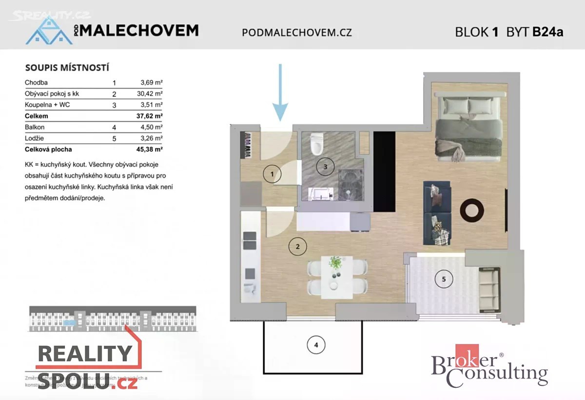 Nabízíme k prodeji moderní byt o dispozici 1+kk s užitnou plochou 38 m², který poskytne dostatek místa pro komfortní bydlení i příjemné chvíle venku. Byt nabízí balkon i lodžii. Byt je umístěn ve 2 nadzemním podlaží domu č. 1, jenž je součástí menšího komplexu tří budov a nabízí více klidu a soukromí. Projekt se blíží dokončení, kolaudace je plánována na prosince 2025. Rezidence Pod Malechovem je ideálním místem pro jednotlivce, páry i rodiny s dětmi. Lokalita nabízí klid, soukromí a dostatek zeleně, přitom však veškeré služby pro pohodlný život máte na dosah. Bytové domy vyrůstají v Českém Brodě, nedaleko náměstí Arnošta z Pardubic. Díky železničnímu spojení se do Prahy dostanete za pouhých 30 minut - rychle, pohodlně a bez stresu z dopravních zácp. Rezidence Pod Malechovem tak spojuje výhody moderního bydlení s atmosférou menšího města a skvělou dostupností do metropole.