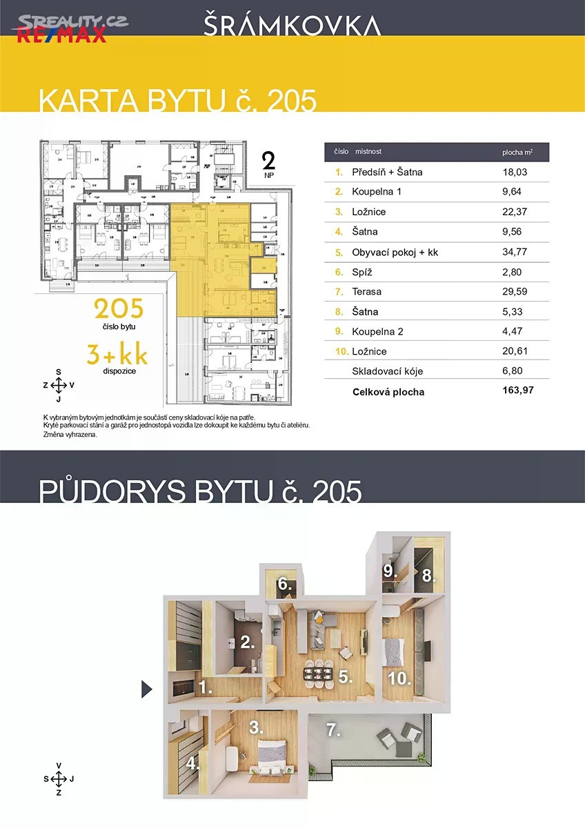 Komfort rodinného domu. Výhody města. To nabízí nadstandardně prostorný byt 3+kk č. 205 s velkou terasou, dvěma koupelnami a šatnami. Ideální volba pro ty, kteří chtějí prostor, klid a kvalitu bez kompromisů. Už při vstupu vás přivítá mimořádně prostorná předsíň o velikosti 18 m², která bez problémů funguje jako velkokapacitní šatna. U pokoje se nachází další samostatná místnost - ideální jako walk-in šatna, pracovna, fitness nebo hobby místnost. Dominantou bytu je velkorysý obývací pokoj s kuchyňským koutem a praktickou spíží, jehož plocha odpovídá bytu 1+kk. Ložnice je umístěna v klidové části bytu a nabízí maximální soukromí - disponuje vlastní šatnou a koupelnou. Druhá, prostorná koupelna je situována centrálně a je pohodlně dostupná z celého bytu. Skutečnou třešničkou na dortu je rozlehlá terasa do tvaru L, částečně krytá, která poskytuje dostatek prostoru pro relaxaci, posezení i zeleň. Vstup na terasu je ze všech obytných místností - přes francouzská okna nebo velkoformátový posuvný HS portál. Samozřejmostí jsou předokenní žaluzie. Byt je orientován na jih a západ, směrem do klidného vnitrobloku. Součástí ceny je sklepní kóje na patře. Možnost dokoupení krytého parkovacího stání v 1. NP Možnost dokoupení uzamykatelné garáže pro jednostopá vozidla ve vnitrobloku. Standardy provedení: dřevěné dubové podlahy interiérové dveře SAPELI - Elegant Komfort rozetové kliky FO-NAXOS-HR dlažby a obklady RAKO koupelnový nábytek Sapho Kare baterie a sanita Hansgrohe sprchové zástěny Hüppe podlahové vytápění Rozměry na kartě bytu jsou pouze orientační. Další informace na stránkách projektu.